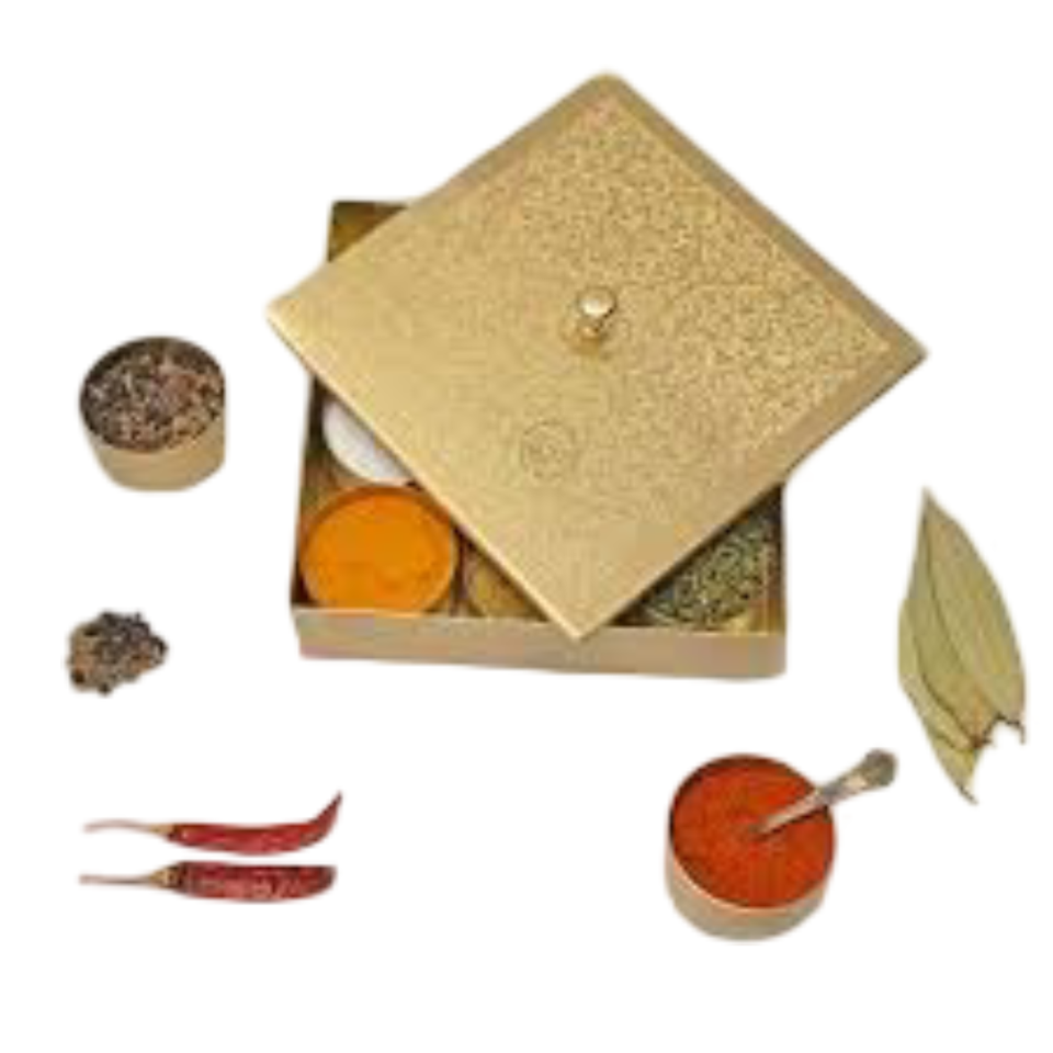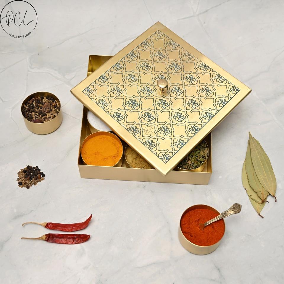 กล่องใส่เครื่องเทศทองเหลืองคุณภาพสูง ดีไซน์ใหม่ กล่องโลหะแบ่งช่องเจ็ดช่อง สำหรับเก็บสมุนไพรและเครื่องเทศในครัว จากอินเดีย