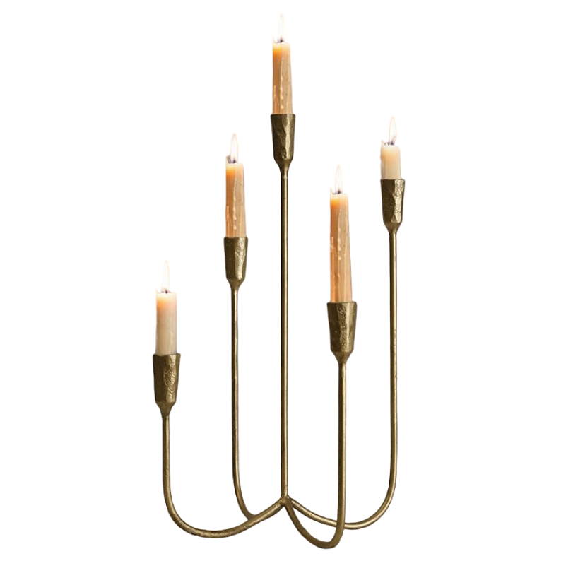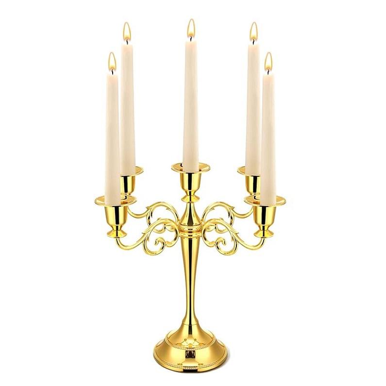 เชิงเทียนทองเหลืองคุณภาพสูงสไตล์วินเทจแบบอาหรับห้าแขน พร้อมการขัดเงาสำหรับตกแต่งบ้าน เชิงเทียนโลหะสำหรับวางบนโต๊ะ
