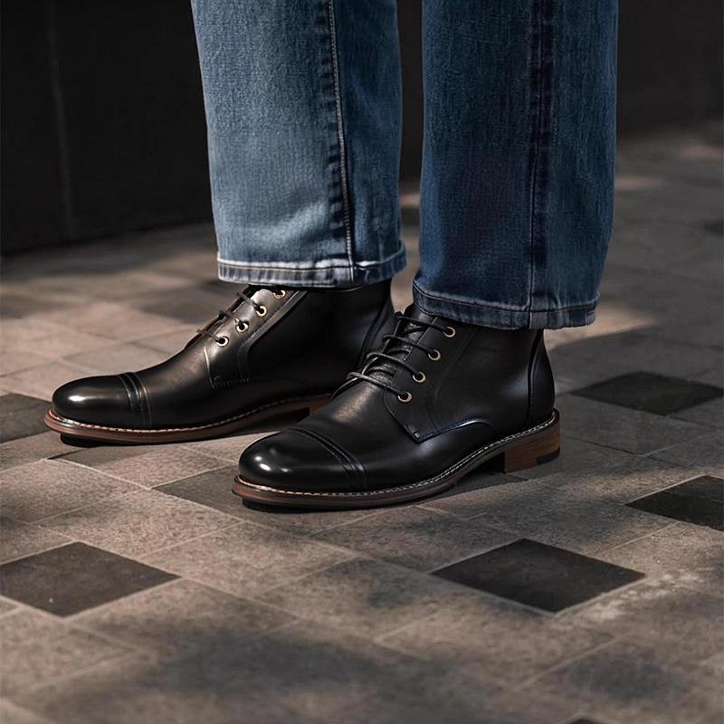รองเท้าบูทหนังวัวสีน้ำตาลคุณภาพสูง ตกแต่งด้วยรูเจาะ และพื้นรองเท้าระบายอากาศได้ดี เหมาะสำหรับสุภาพบุรุษในงานธุรกิจ