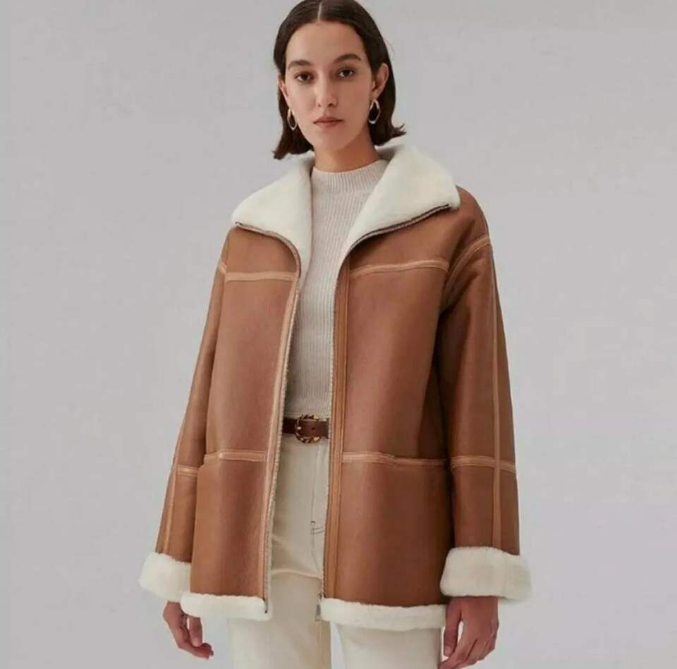 แจ็กเก็ตหนังสีน้ำตาลสำหรับผู้หญิงมีปกหนังและคาดเอวผลิตแบบมืออาชีพ