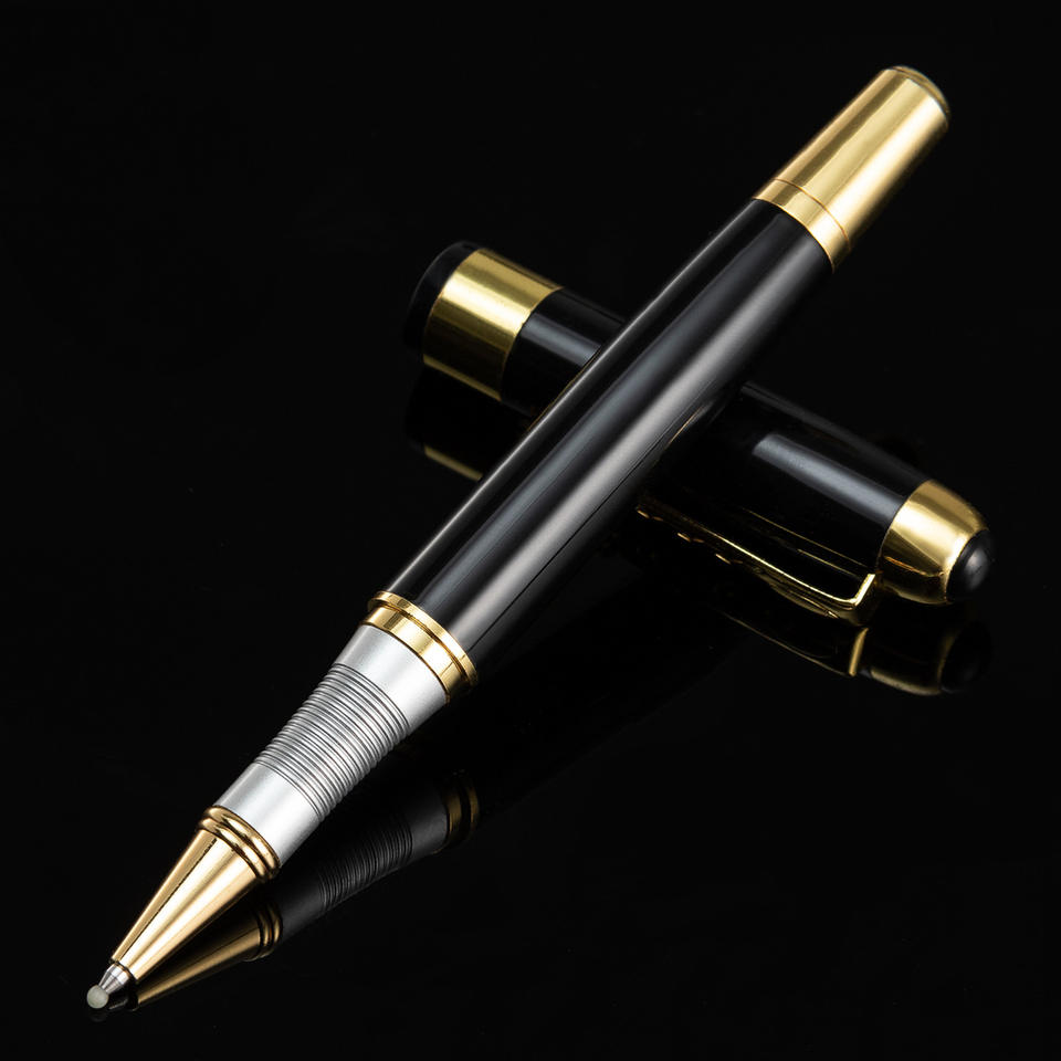 ปากกาลูกลื่นโลหะคุณภาพสูง ดีไซน์หรูหรา พร้อมโลโก้บริษัทแบบกำหนดเอง ตกแต่งขอบสีดำทอง หมึกสีน้ำเงิน/ดำ เหมาะสำหรับใช้เป็นของแจก