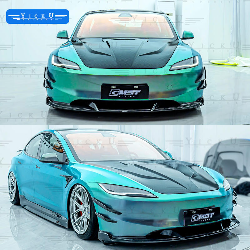 ชุดแต่งพลั่วหน้าคาร์บอนไฟเบอร์ CMST คุณภาพสูงพร้อมริมฝีปากด้านหน้าเหมาะสําหรับรถ Tesla รุ่น 3 ที่ได้รับการอัปเดตในปี 2023