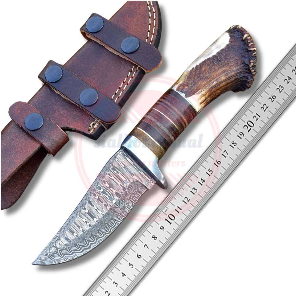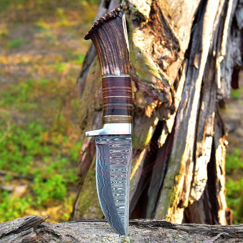 มีดล่าสัตว์ใบมีดตายตัวเหล็กกล้าคาร์บอนดามัสกัสคุณภาพสูง มีดสำหรับล่าสัตว์และตั้งแคมป์ ด้ามจับแบบเต็มด้าม