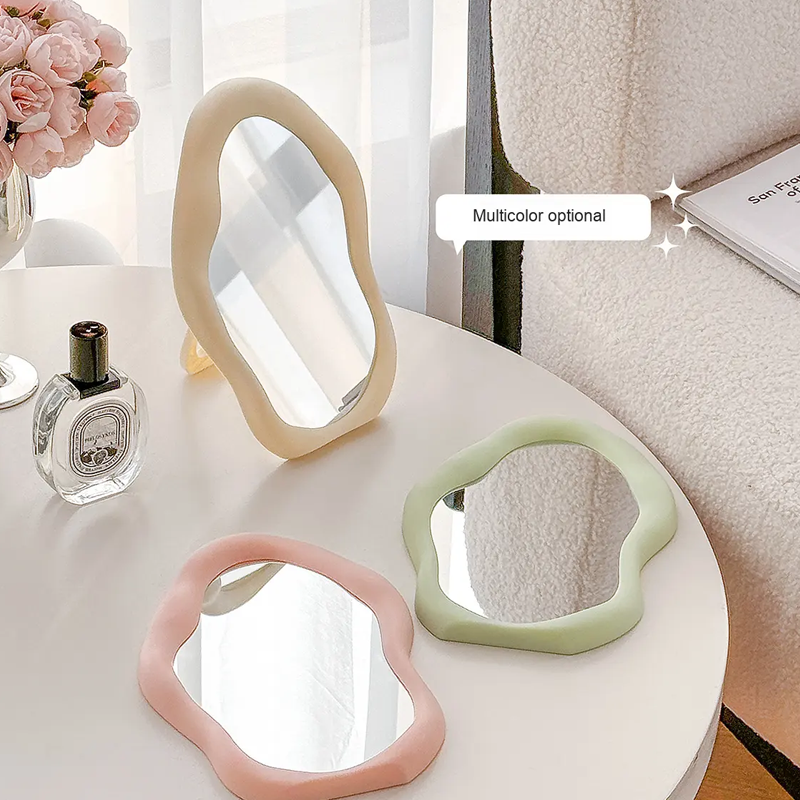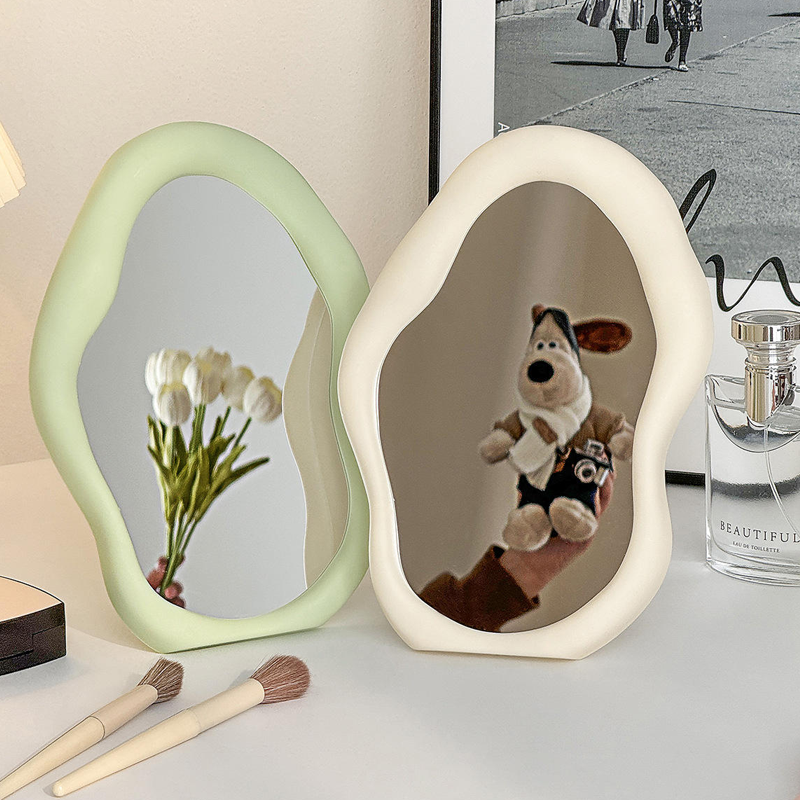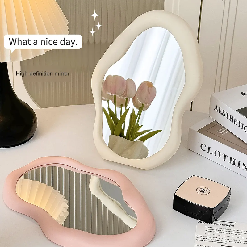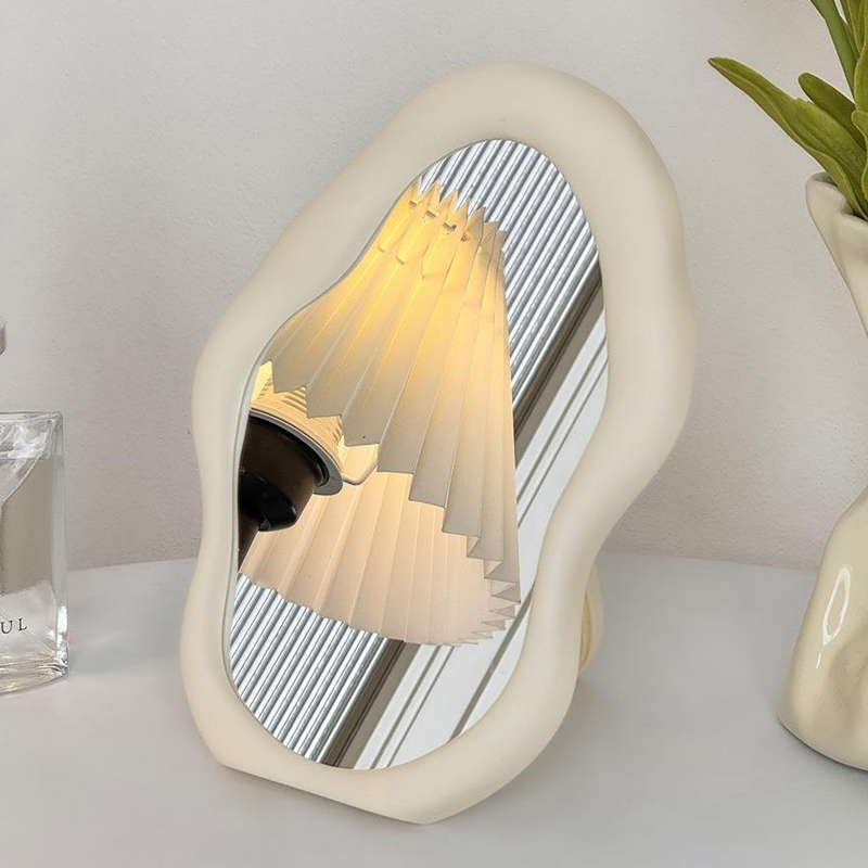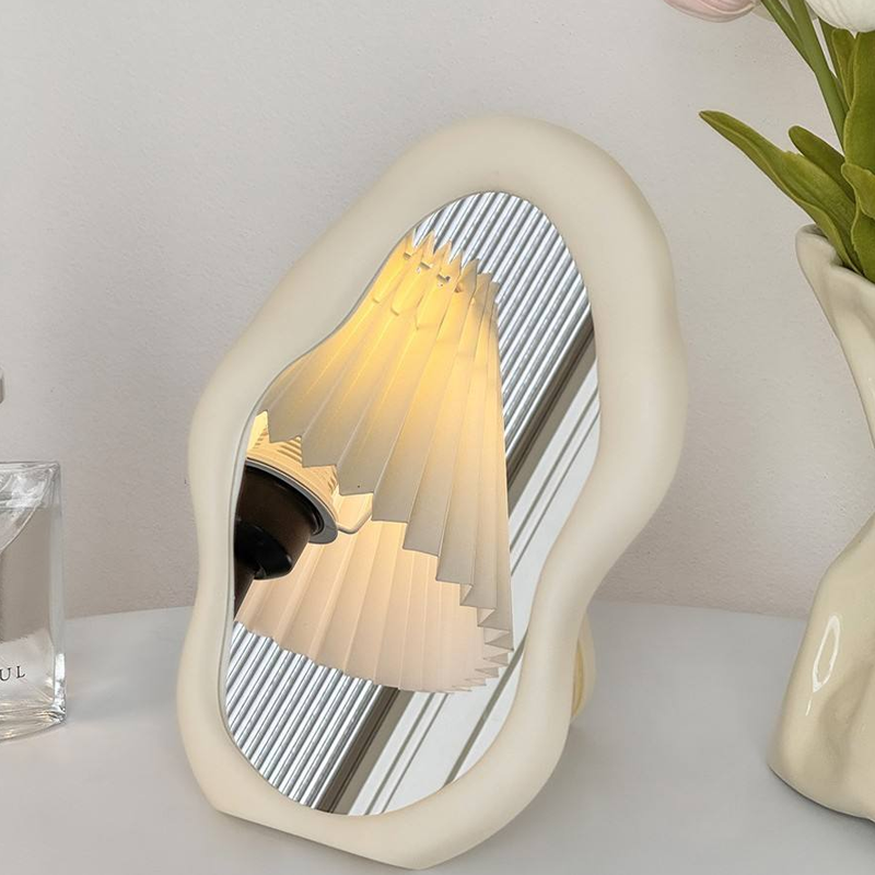 กระจกตั้งโต๊ะแบบพับได้สองด้านทรงรีไม่สมมาตรสีครีมคุณภาพสูงพร้อมไฟส่องสว่างสำหรับใช้ในบ้านและหอพัก
