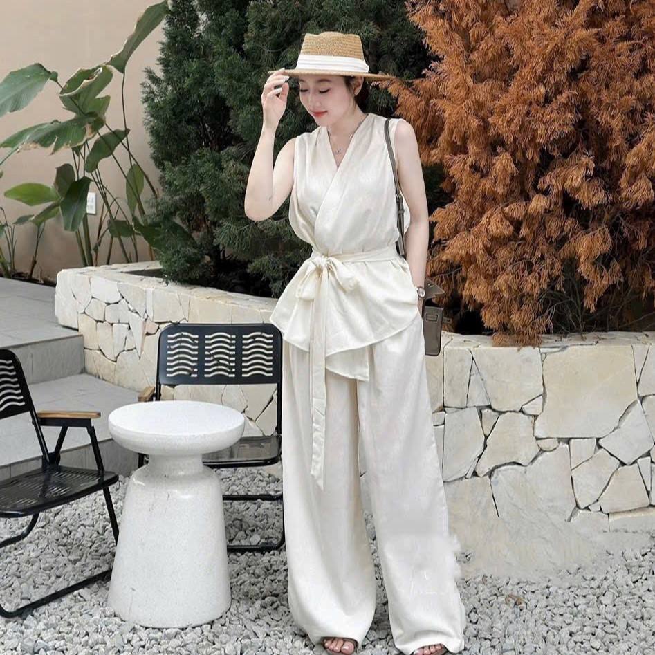 ชุดเสื้อและกางเกงผ้าชีฟองสีพื้นคุณภาพสูงสำหรับผู้หญิง สวมใส่สบายในช่วงฤดูร้อน