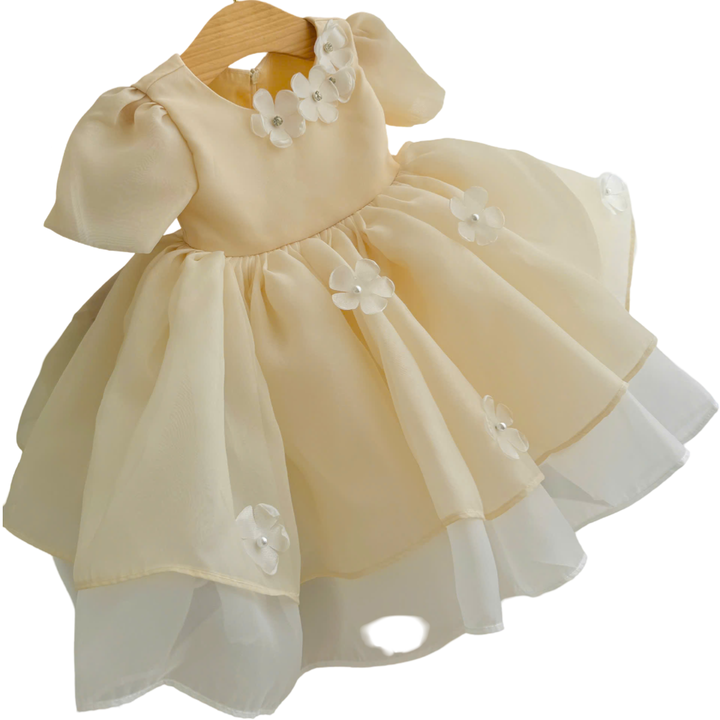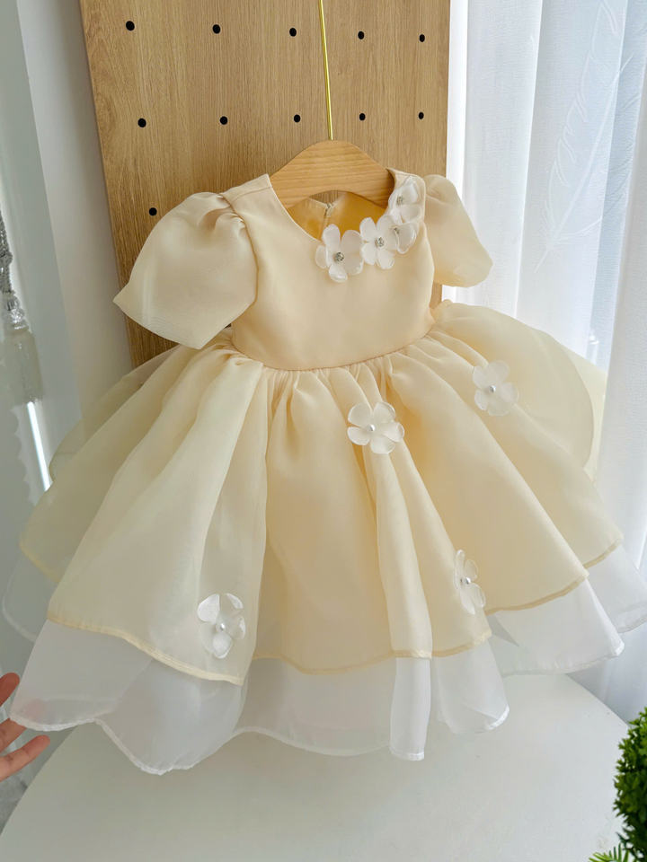 เดรสแม็กซี่สไตล์ลำลองสำหรับเด็กผู้หญิงชุดเดรสคล้องคอลายดอกไม้ประดับ3D เดรสตาข่ายแบบหลายชั้น
