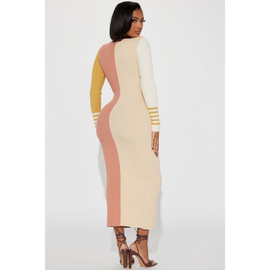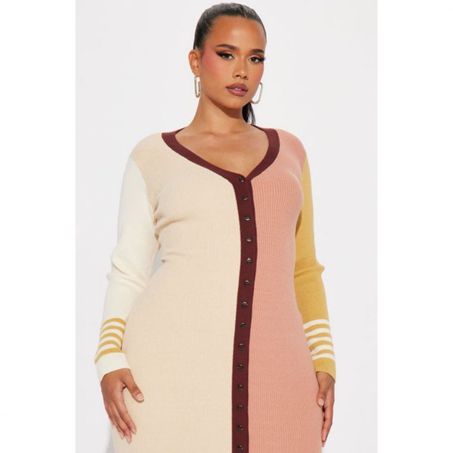 เดรสไหมพรมทรงเข้ารูป คอวี แต่งผ้าต่อสีตัดกัน สไตล์มินิมอล วินเทจ คุณภาพสูง ราคาประหยัด