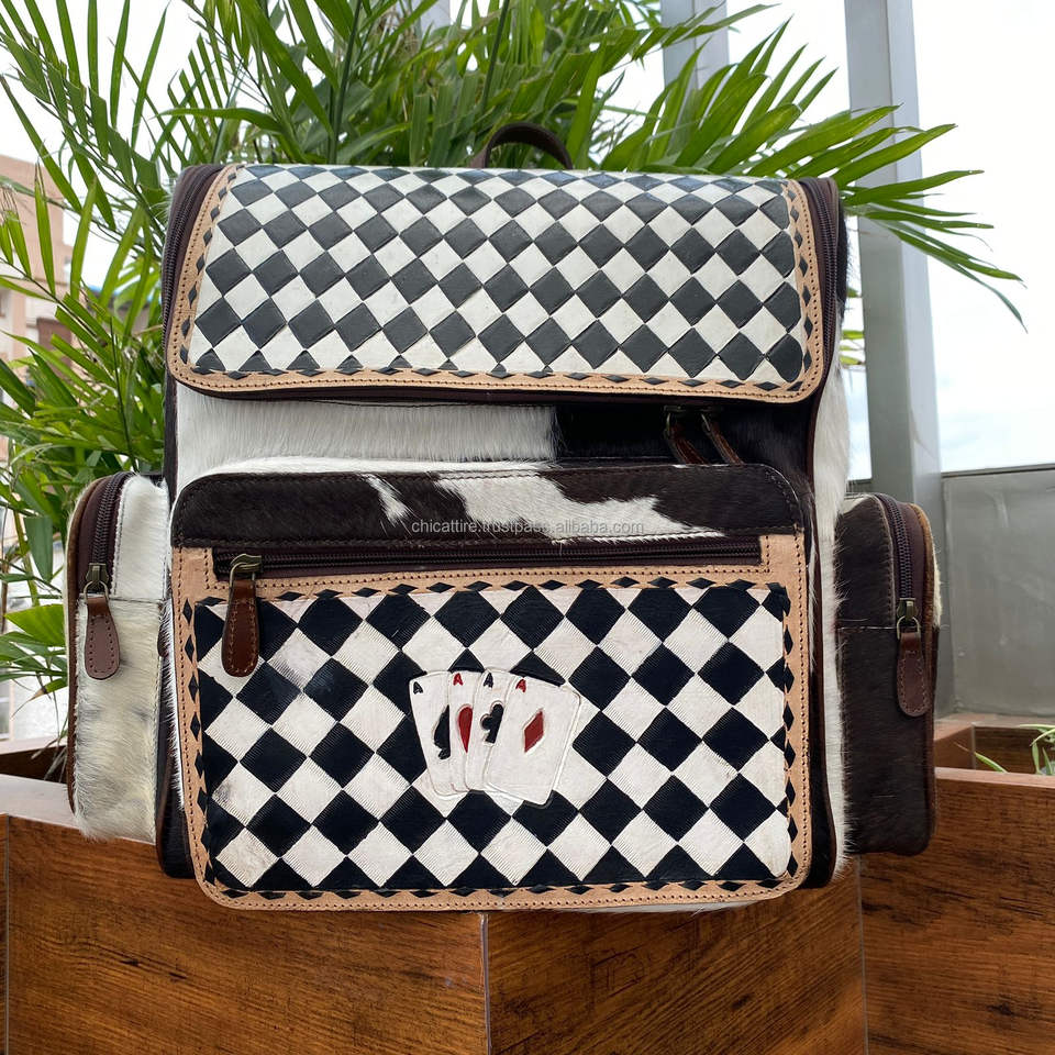กระเป๋าเป้สะพายหลังผ้าอ้อมแบบมีซิปขนวัวธุรกิจลายตารางหมากรุกหนังเครื่องมือหนังทนทานดีไซน์หรูหรา