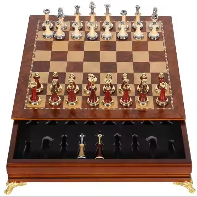 ชุดหมากรุกคุณภาพสูงพร้อมกระดานหมากรุกทองเหลืองและกระดานพับไม้สำหรับเล่นเกมโชว์และใช้เป็นของขวัญ