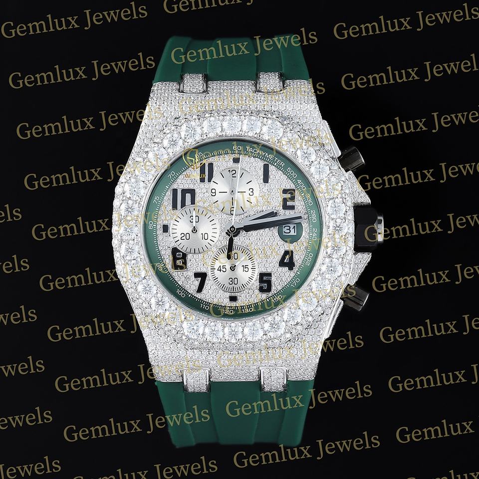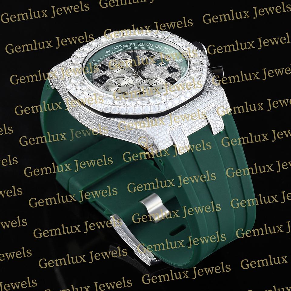 นาฬิกาเพชรสไตล์ฮิปฮอปสำหรับผู้ชายโครโนกราฟประดับเพชรสายรัดยางสีเขียวเพชรสำหรับผู้ชาย