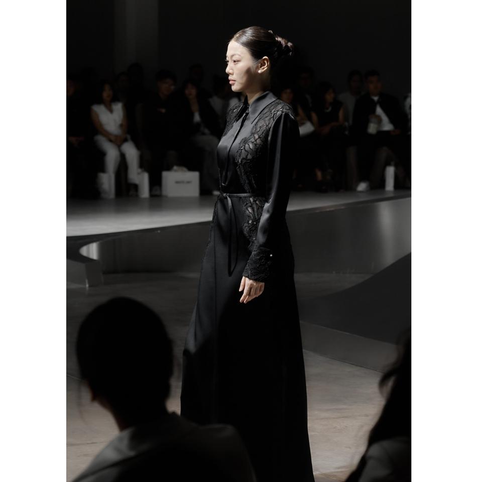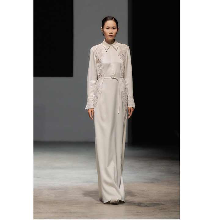เสื้อผ้าคุณภาพสูง ชุดเดรสหรูหรา ชุดเดรสปักประดับใหม่ ยาวคลุมพื้น 89% ไตรอะซิเตท 11% โพลีเอสเตอร์ เดรสคอปก