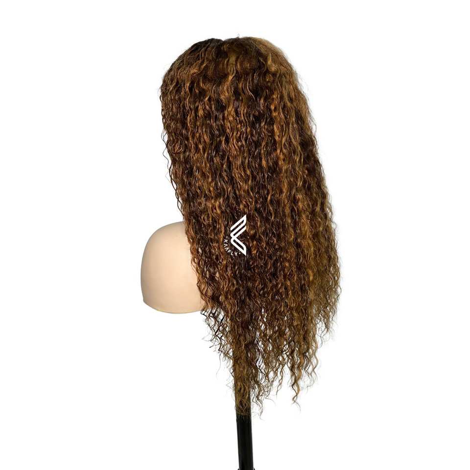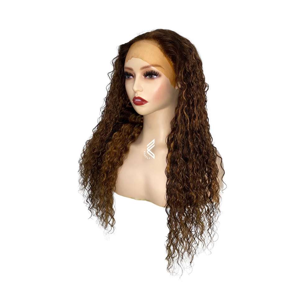 วิกผมแท้มีลูกไม้ด้านหน้าผมหยักศกสีน้ำตาล