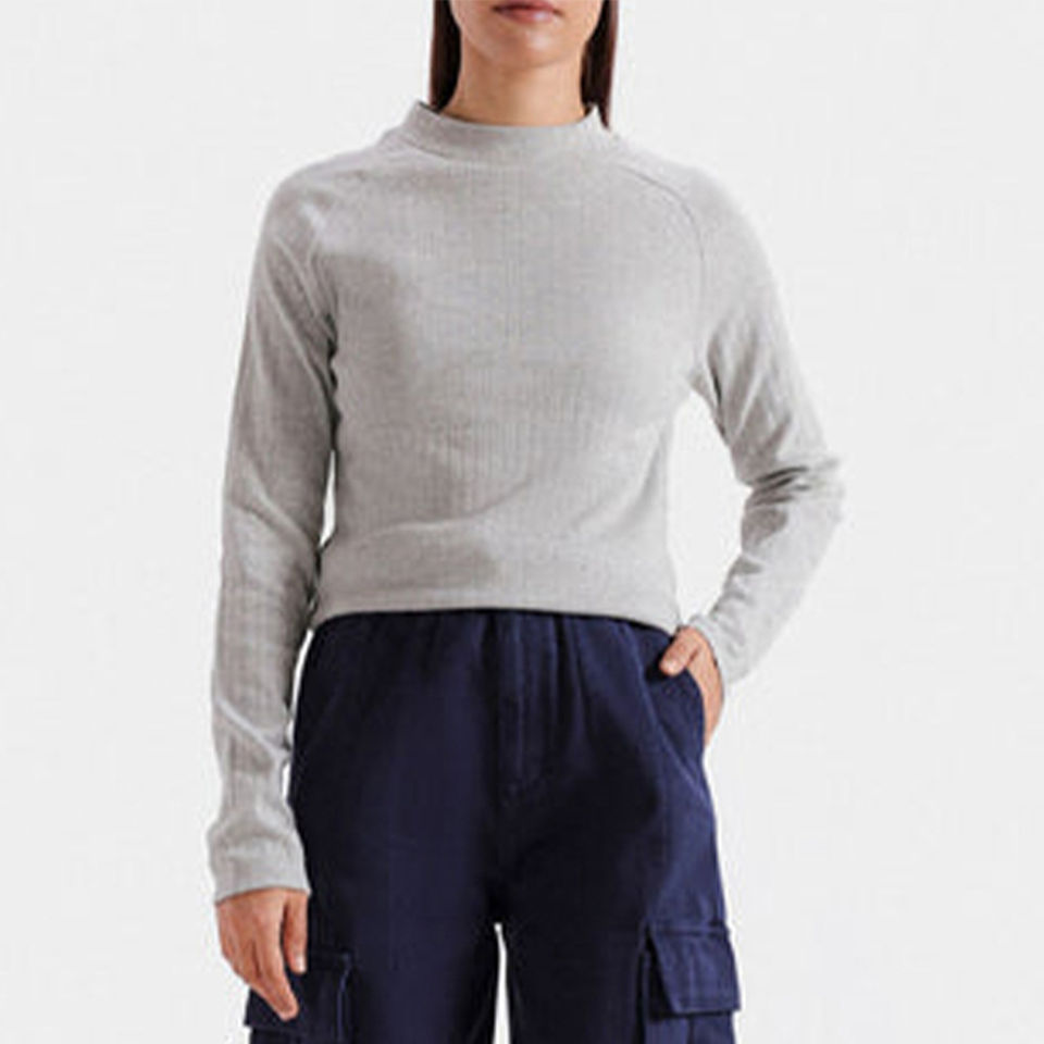 เสื้อยืดคอกลมแขนยาวผ้าแคนวาสคุณภาพสูงสำหรับผู้หญิง เนื้อผ้าริบ ระบายอากาศได้ดี ไม่เป็นขุย แห้งเร็ว ทรงปกติ