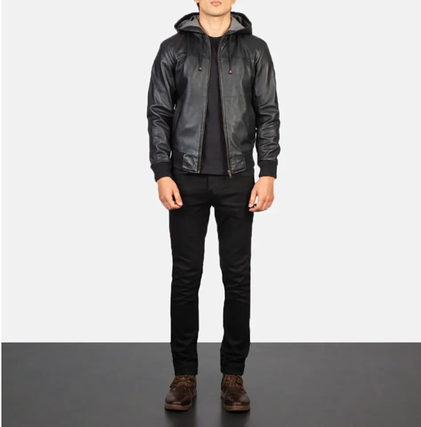 เสื้อแจ็กเก็ตหนังสีดำพร้อมฮู้ดส่งออกและผู้ผลิต