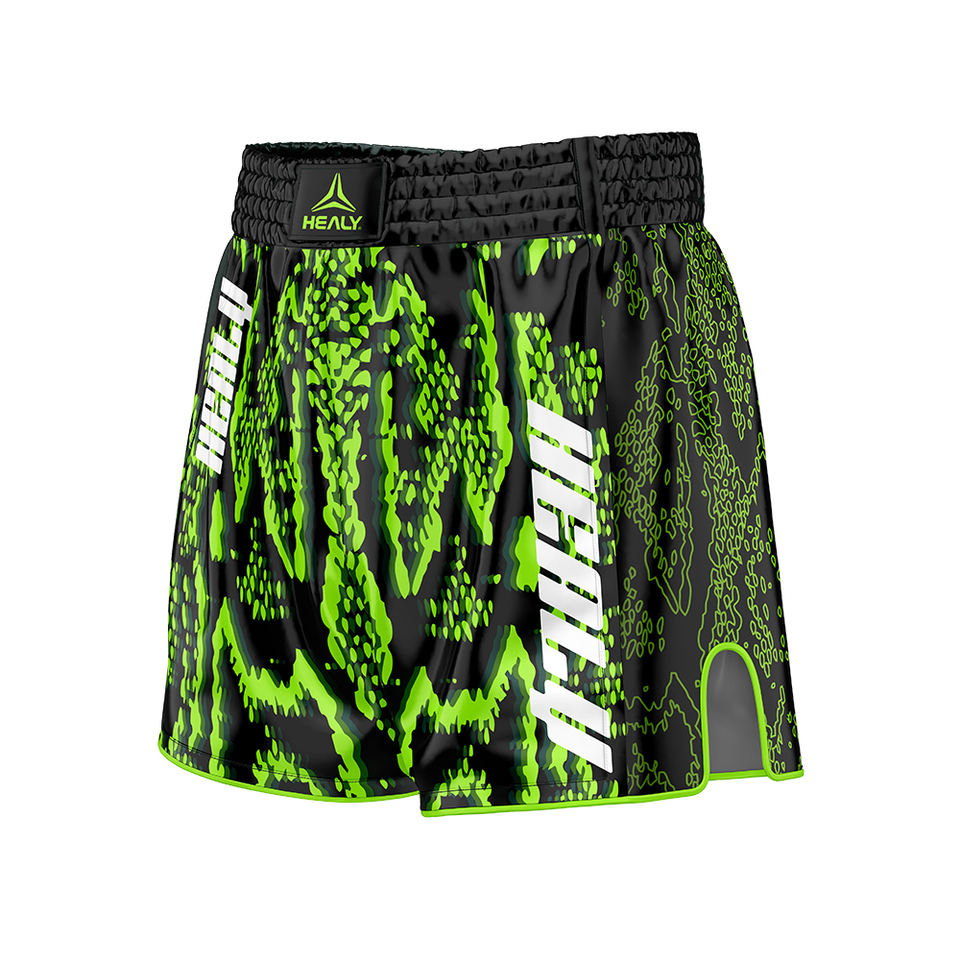 กางเกงขาสั้นต่อยมวยยืดหยุ่นสูงสำหรับทุกเพศเครื่องแบบศิลปะการต่อสู้สีเขียวต่อสู้ฟรีสำหรับเล่นกีฬาทำจากโพลีเอสเตอร์100%