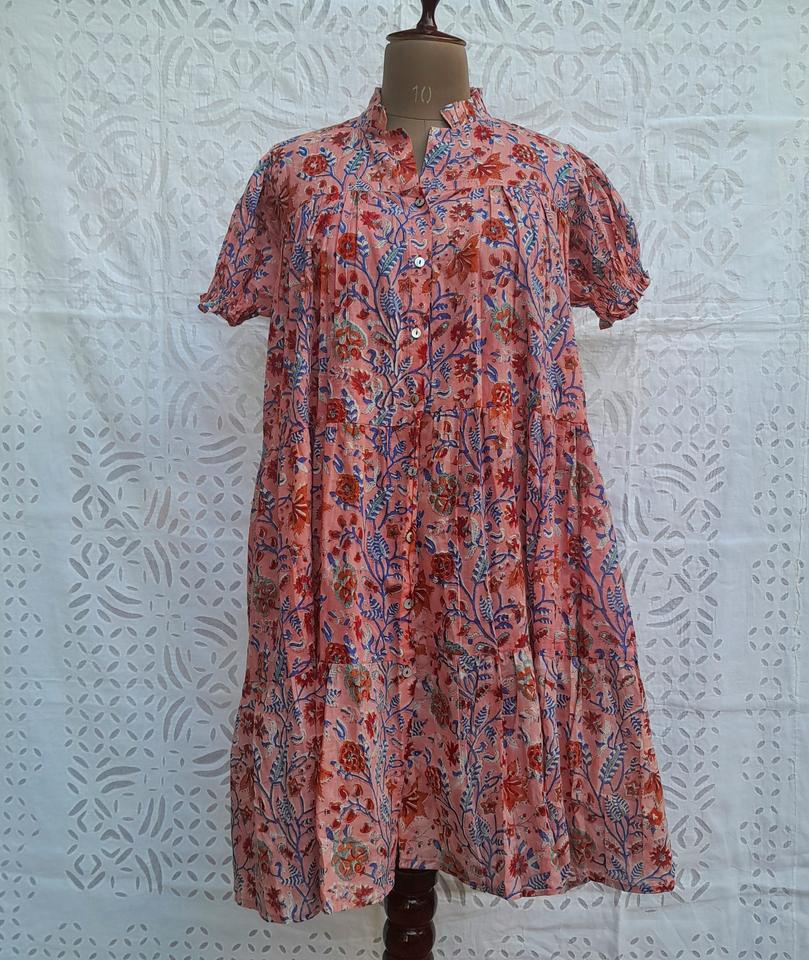 ชุดเดรสสั้นผ้าฝ้ายพิมพ์ลายบล็อกมือสำหรับผู้หญิง ขายส่งจากดีไซเนอร์