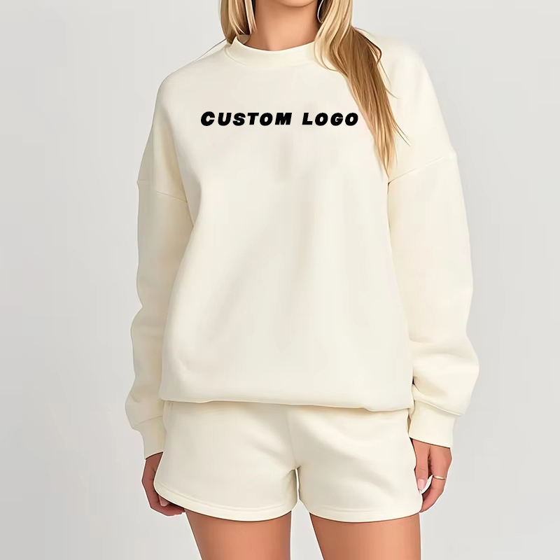 เซ็ตเสื้อสเวตเตอร์คอตตอนแขนสั้นสำหรับผู้หญิงเสื้อสเวตเชิ้ตคอกลมพิมพ์ลายแบบกำหนดเอง