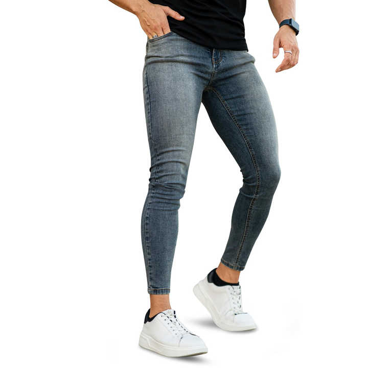 กางเกงยีนส์ทรงสลิมฟิตผ้าฝ้ายเอวสูงของผู้ชายกางเกงยีนส์แฟชั่นมีกระเป๋าแบบขาดตกแต่ง