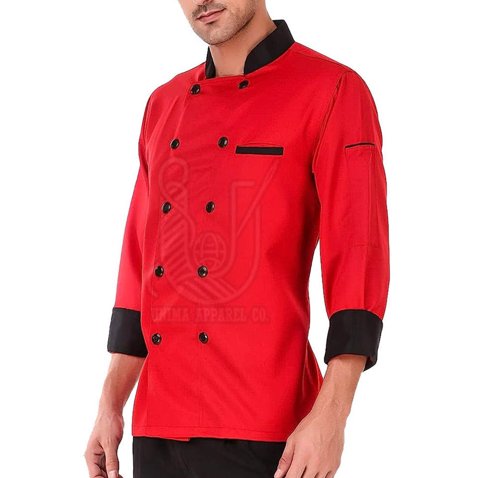 เสื้อเชฟแขนยาวผ้าฝ้ายคุณภาพสูง กระดุมสองแถว ตรวจจับการเสียดสีด้วยเข็ม บริการ OEM สำหรับผู้ชาย ใช้ในร้านอาหาร บาร์ ปรับแต่งได้