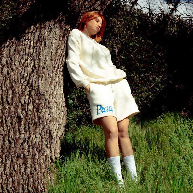 ชุดวอร์มสองชิ้นแบบสวมหัวมีฮู้ดสำหรับผู้หญิงผ้าคอตตอนพร้อมเสื้อฮู้ดกางเกงขาสั้นมีโลโก้แบบกำหนดเอง