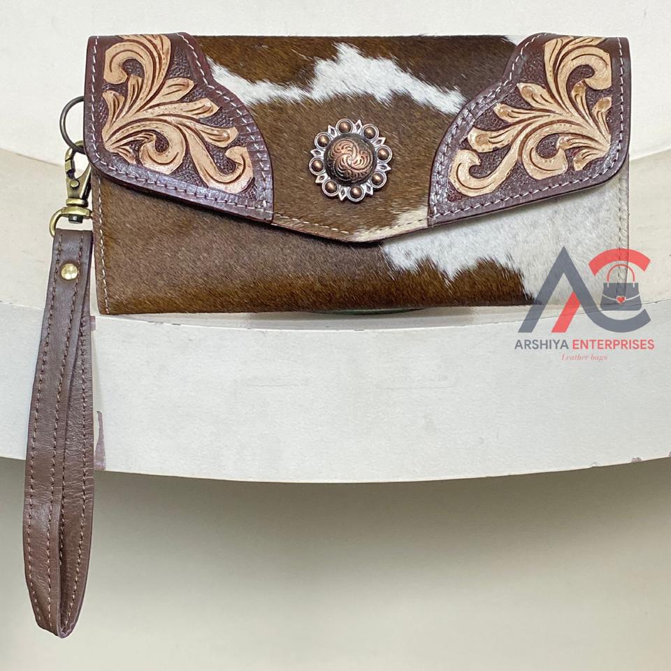 กระเป๋าสตางค์หนังวัวคุณภาพสูงสำหรับผู้หญิง ป้องกัน RFID พร้อมสายคล้องมือ ใส่บัตรและเงินสด หนังแท้ลายสลักมือ แบบยาว พร้อม Concho