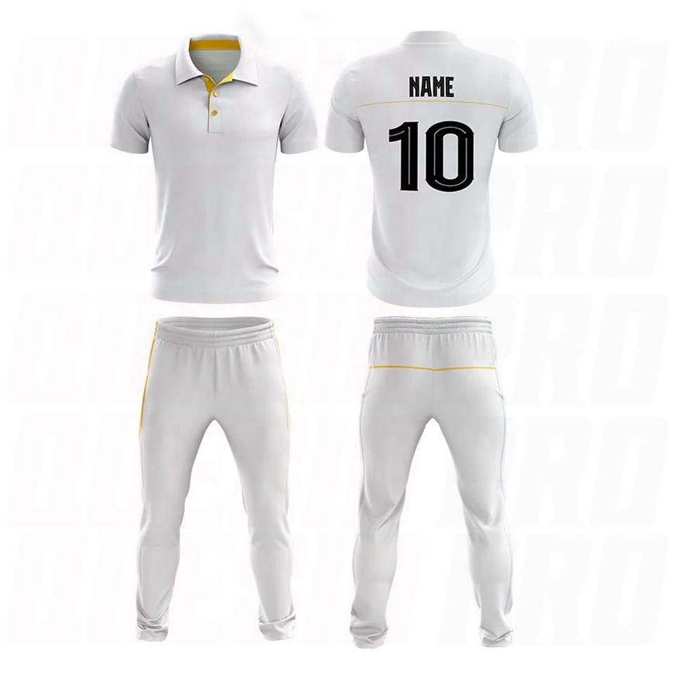 ชุดยูนิฟอร์มคริกเก็ตคุณภาพสูง สีขาว พร้อมโลโก้แบรนด์ ชื่อทีม เสื้อเจอร์ซีย์ระบายอากาศได้ดี สำหรับทีมคริกเก็ต ใช้ในการแข่งขันและฝึกซ้อม