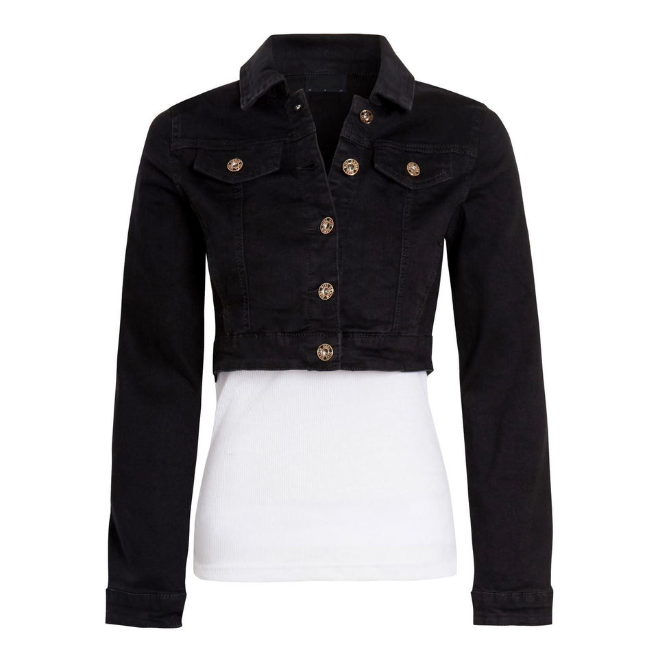 แจ็กเก็ตยีนส์ครอปสำหรับผู้หญิงเสื้อแจ็กเก็ตยีนส์ผ้าฝ้ายมีกระดุมเย็บปะต่อกันฤดูใบไม้ร่วง