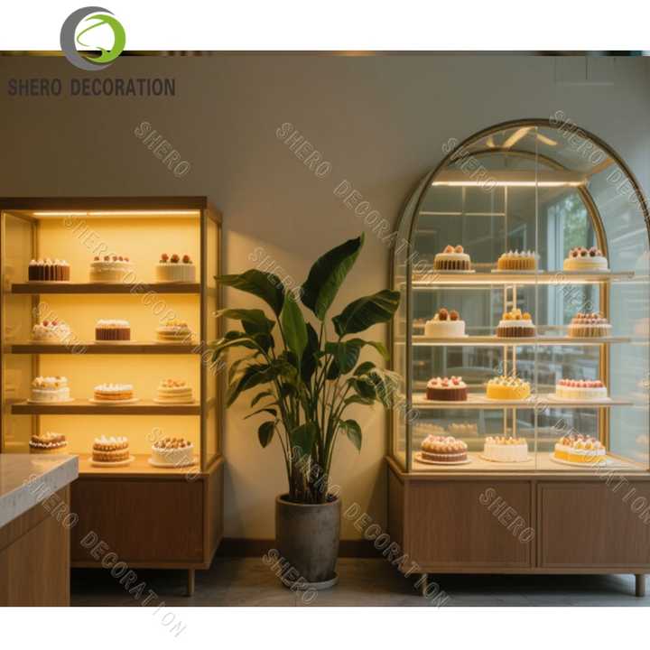 ตู้โชว์เค้กกระจกโค้งคุณภาพสูงพร้อมไฟ ตู้โชว์ขนมปังและของหวานแบบกำหนดเองสำหรับร้านเบเกอรี่