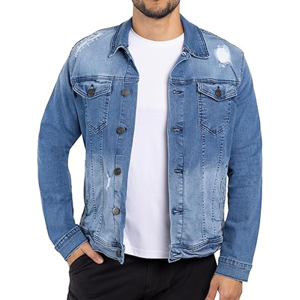 แจ็กเก็ตยีนส์สีน้ำเงินวินเทจสำหรับผู้ชายเสื้อแจ็กเก็ตยีนส์แขนยาวเข้ารูปลำลองแบบกำหนดเอง