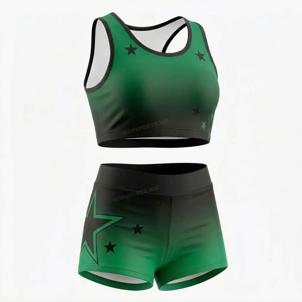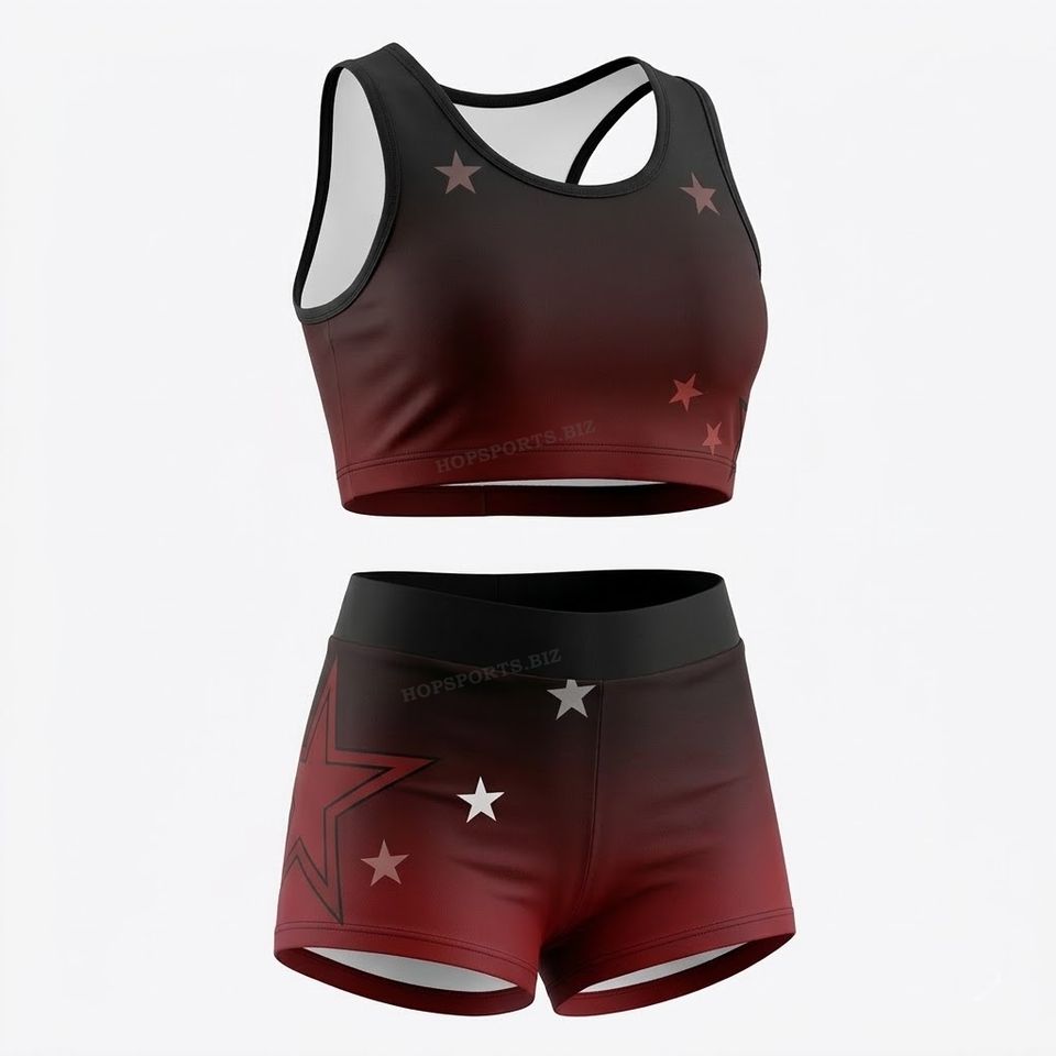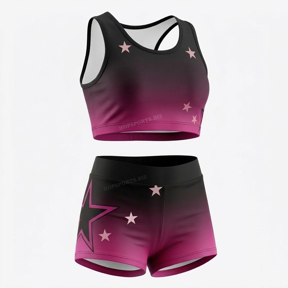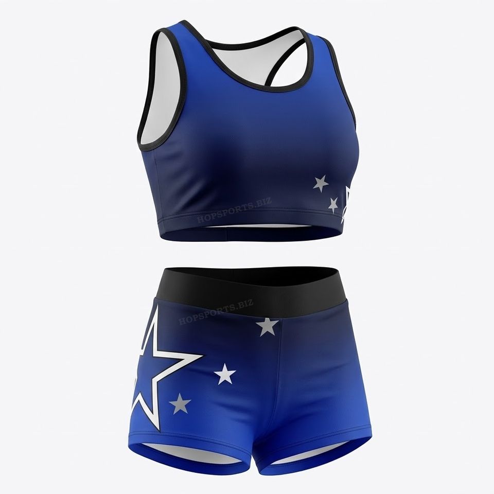ชุดกีฬาเชียร์ลีดเดอร์คุณภาพสูงแบบกำหนดเอง พิมพ์ลายสำหรับชุดเสื้อชั้นในกีฬาและกางเกงขาสั้นสำหรับเชียร์ ชุดเต้นรำ ชุดฝึกซ้อมเต้น