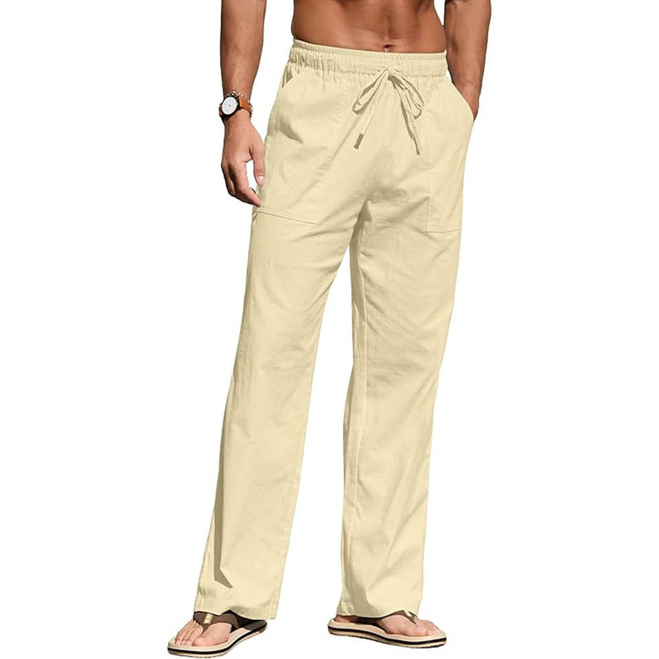 กางเกงขากว้างสำหรับผู้ชายกางเกงเอวยางยืดปานกลางแบนกันลมระบายอากาศได้สีพื้นดีไซน์ตามสั่ง