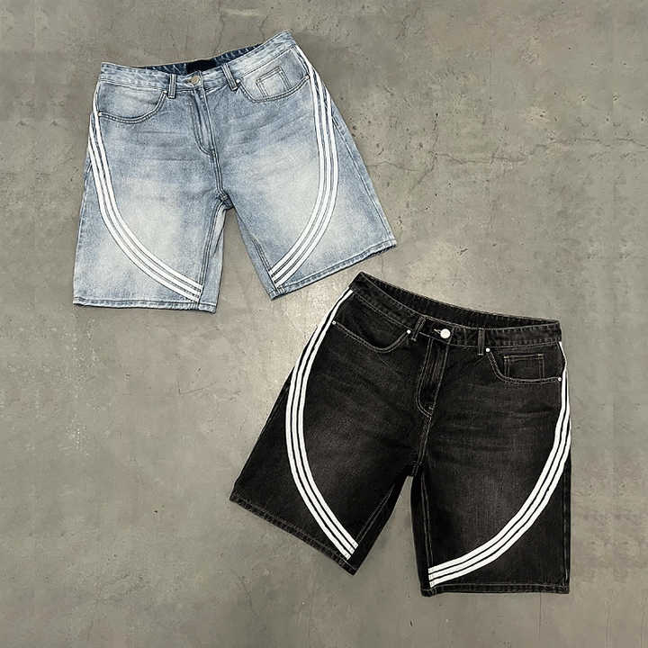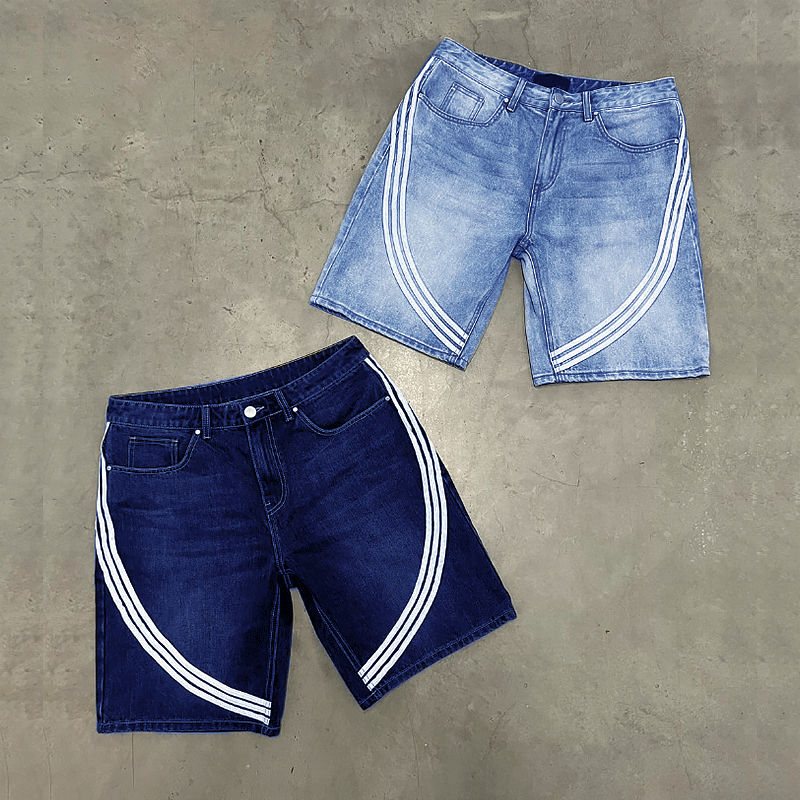 กางเกงขาสั้นผ้ายีนส์สำหรับผู้ชายแนวสตรีทแวร์แนวสตรีทแวร์ลายทางลำลองปักโลโก้ได้ตามต้องการ