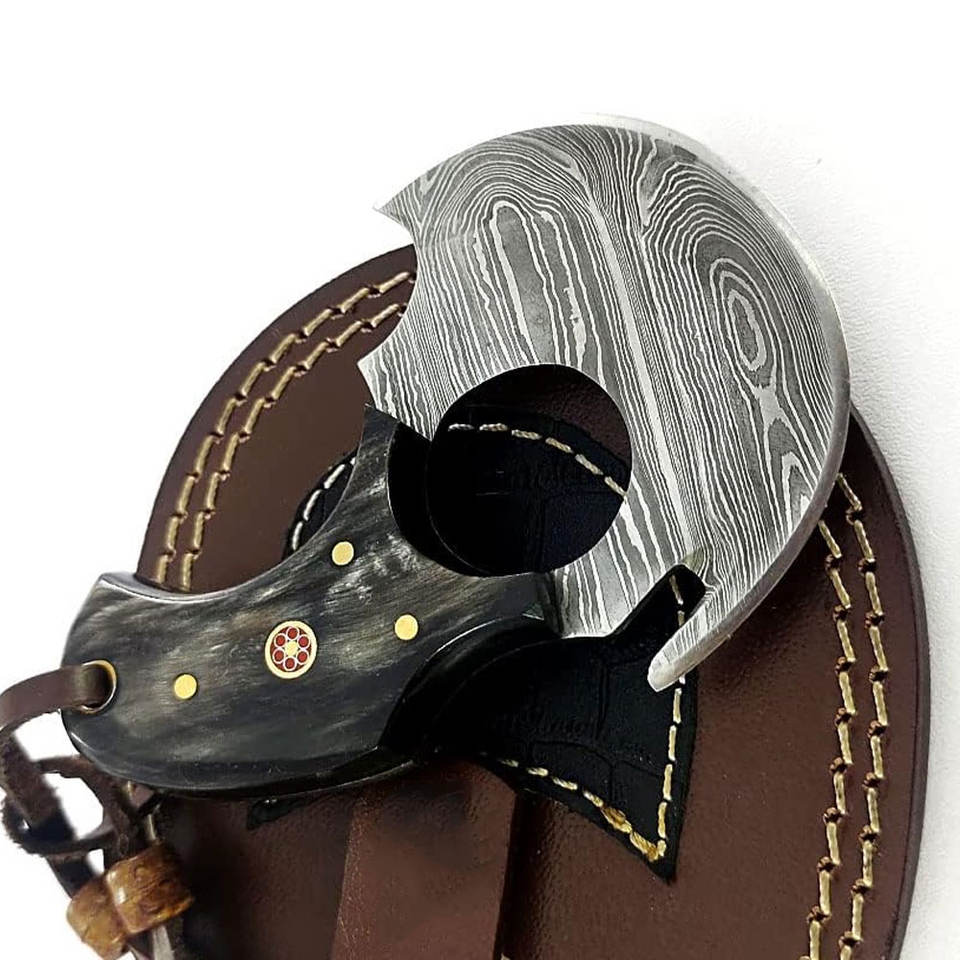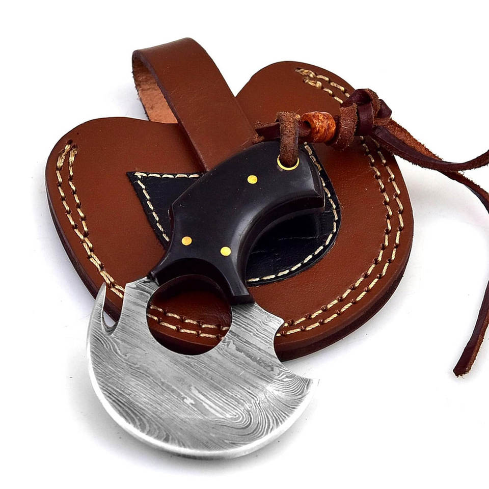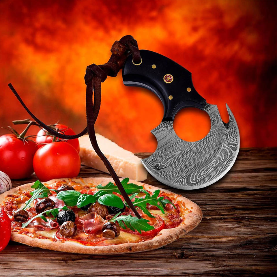 มีดเชฟเหล็กดามัสกัสสไตล์ญี่ปุ่นทำด้วยมือพร้อมปลอกหนังสำหรับตัดพิซซ่า