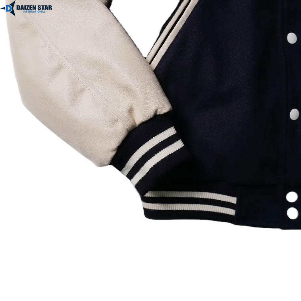 แจ็คเก็ตวาร์ซิตี้แบบกำหนดเองคุณภาพสูงสำหรับฤดูหนาว ปักลาย ตัวเสื้อทำจากผ้าขนสัตว์ แขนเสื้อทำจากหนัง-OEM/ODM ขายส่ง กันลม