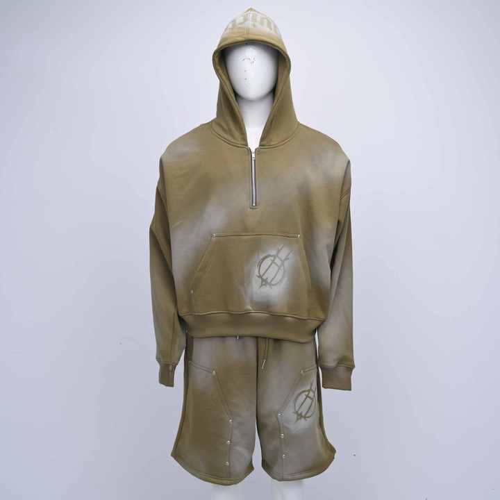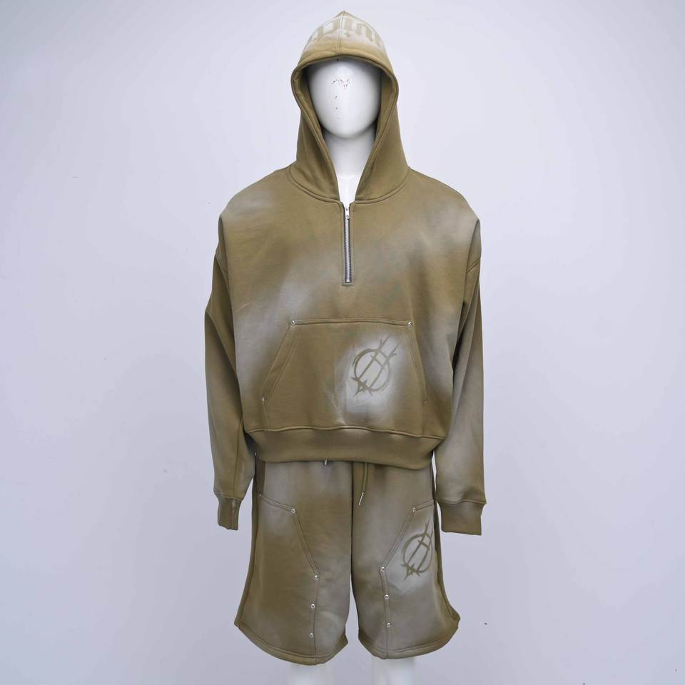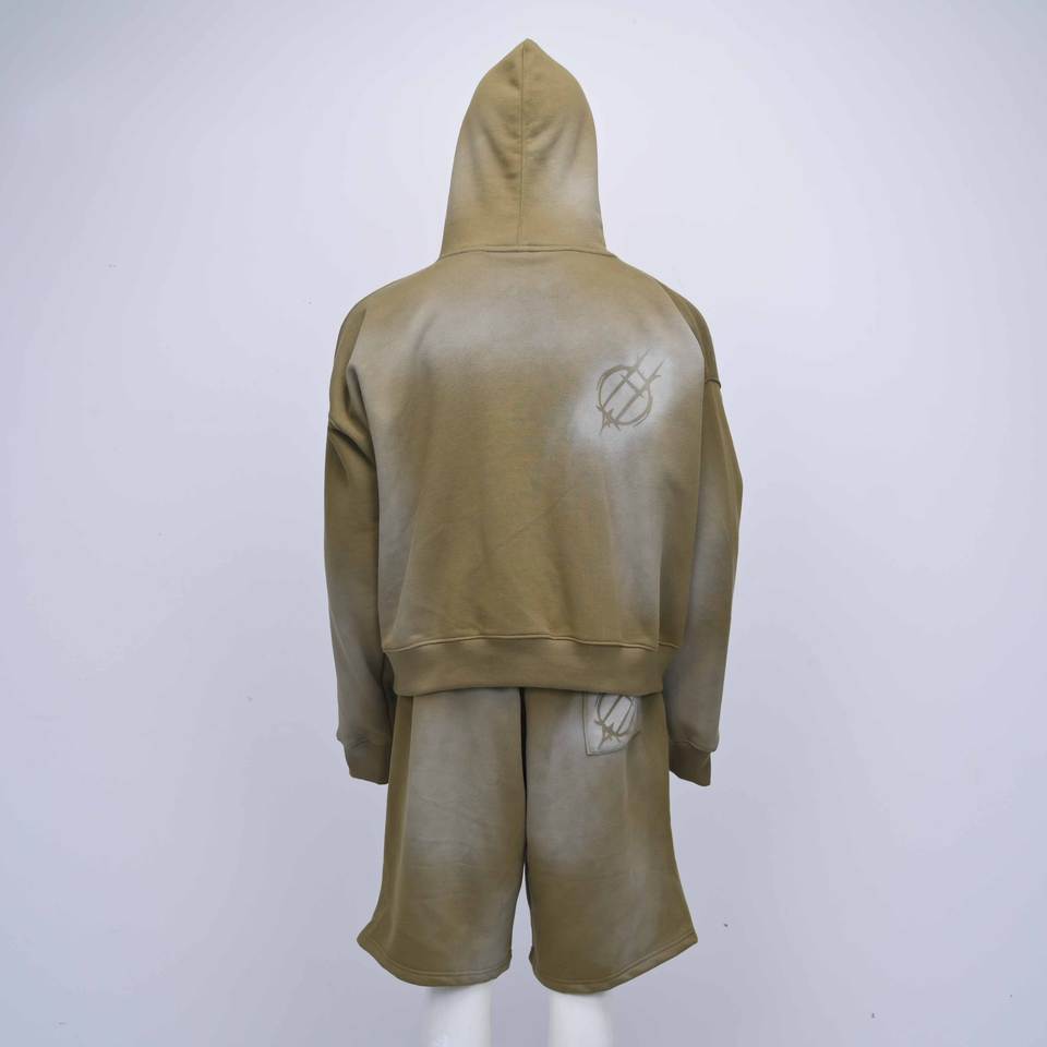 ชุดเซ็ตแทรคสูทลำลองสตรีทแวร์สีดำแบบย้อมสีเอซิด คุณภาพสูง สั่งทำโลโก้ได้ ระบายอากาศได้ดี เป็นมิตรกับสิ่งแวดล้อม พร้อมกางเกงขาสั้นและเสื้อฮู้ด