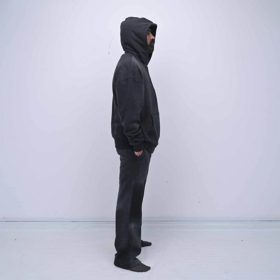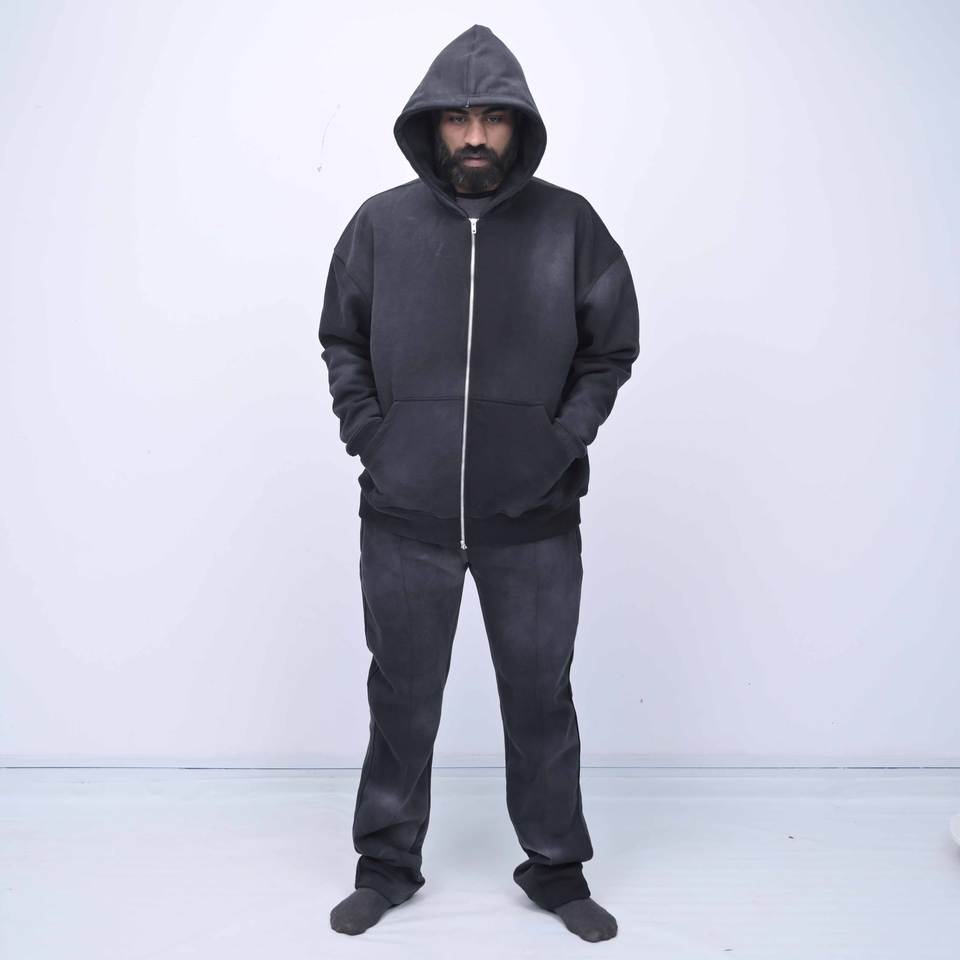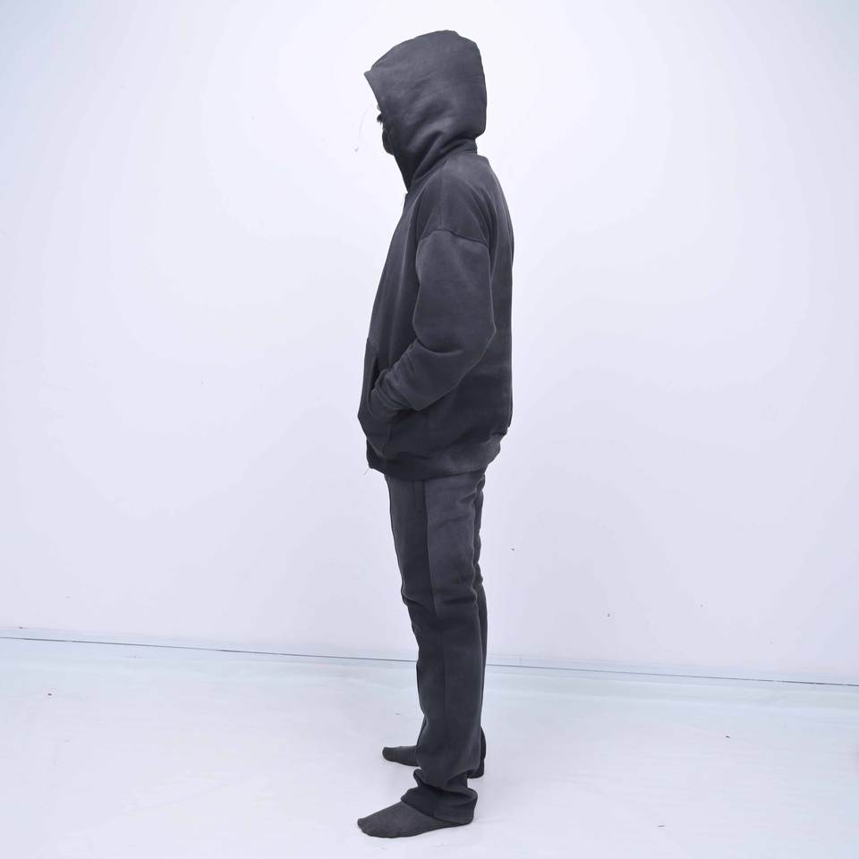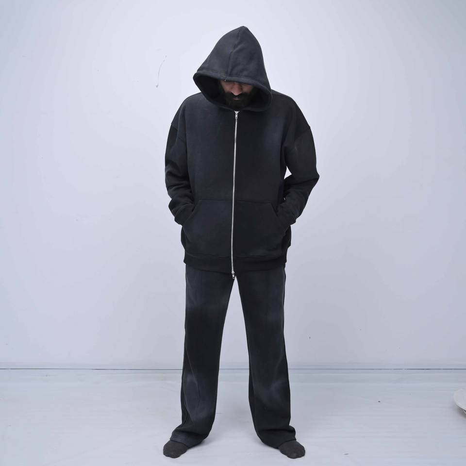 ชุดกีฬาลำลองสีดำแบบย้อมสีเอซิดคุณภาพสูงพร้อมโลโก้สั่งทำพิเศษ ชุดเซ็ตสองชิ้นสไตล์สตรีทแวร์