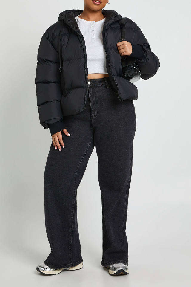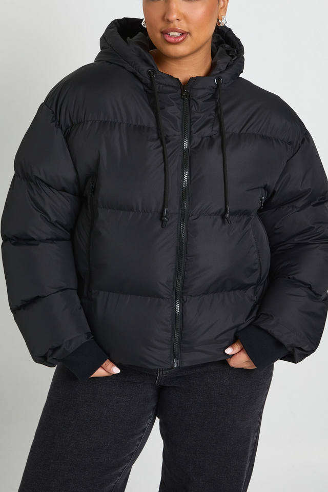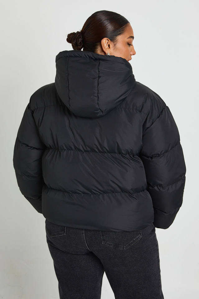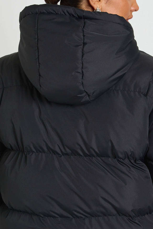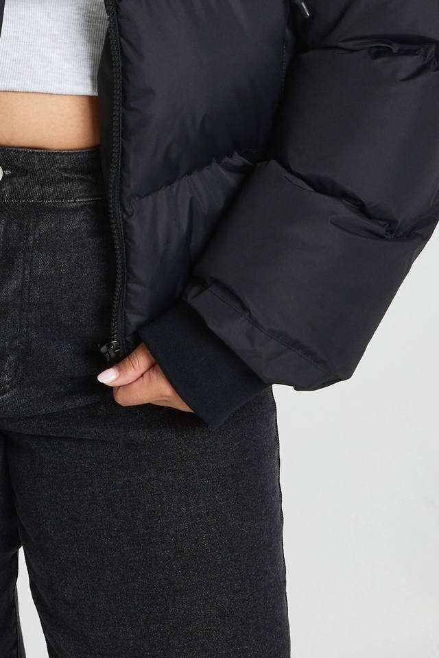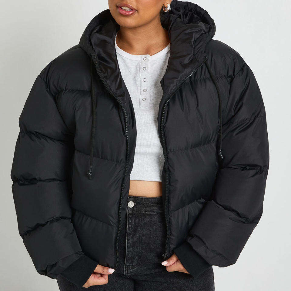 เสื้อแจ็คเก็ตพัฟเฟอร์ผู้หญิงแบบมีฮู้ดสีดำ ดีไซน์โลโก้คุณภาพสูง บุนวม กันลม อุ่นสบายสำหรับฤดูหนาว เหมาะสำหรับกิจกรรมกลางแจ้ง