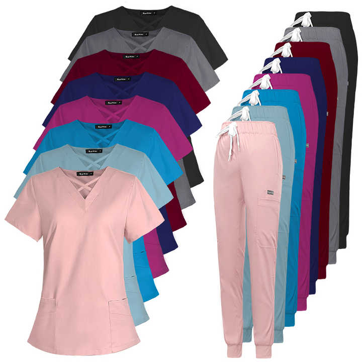 ชุดสครับพยาบาลทางการแพทย์ของผู้หญิงชุดเครื่องแบบทางการแพทย์แบบยืดหยุ่นมีกระเป๋าใส่โลโก้ออกแบบได้ตามต้องการ