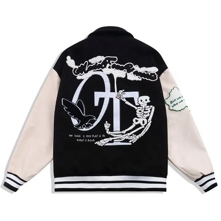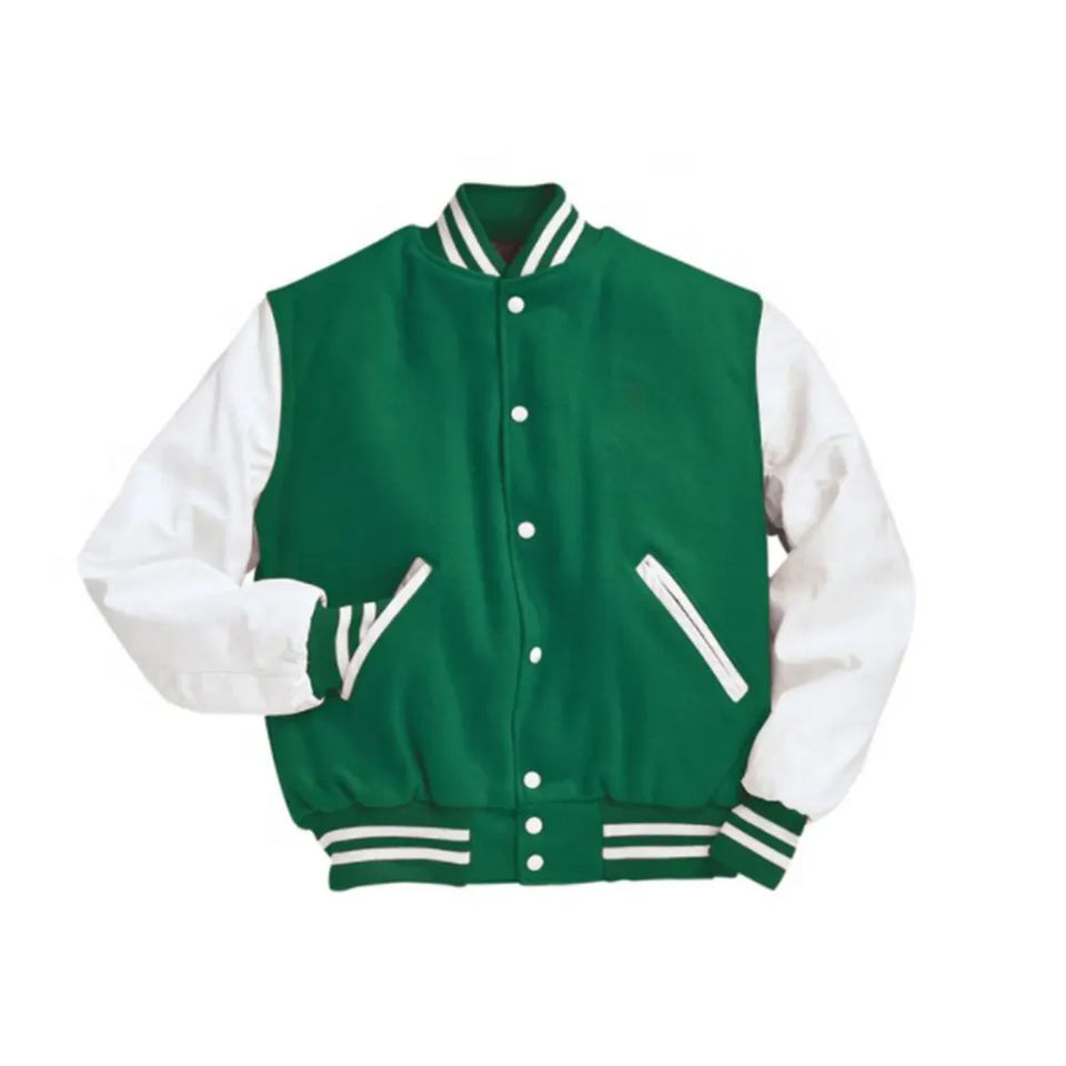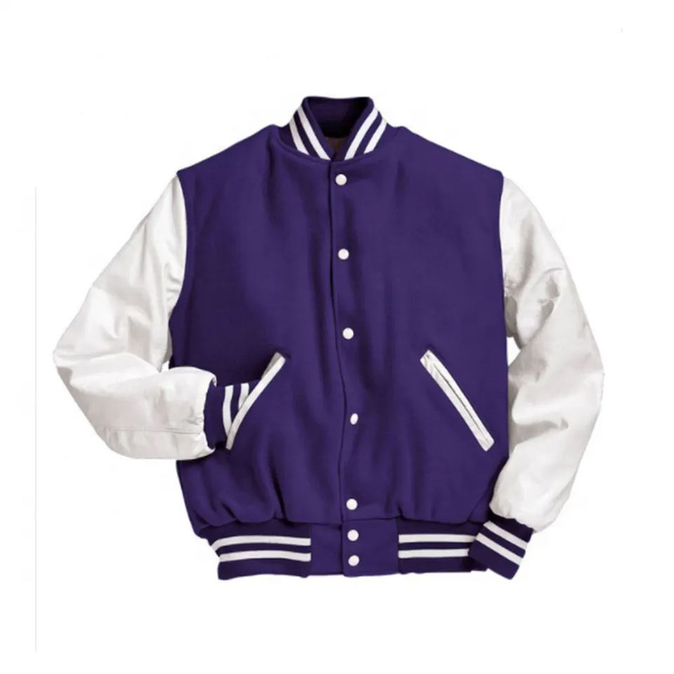แจ็คเก็ตเลตเตอร์แมนแบบสั่งทำคุณภาพสูงสำหรับผู้ชาย แขนหนังแท้ ปักด้วยไหมเชนิลล์ ซับในโพลีเอสเตอร์ 100%