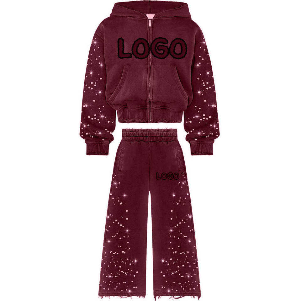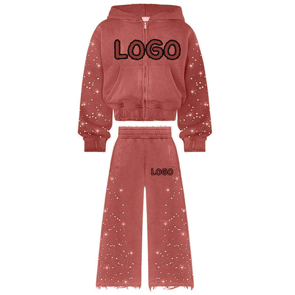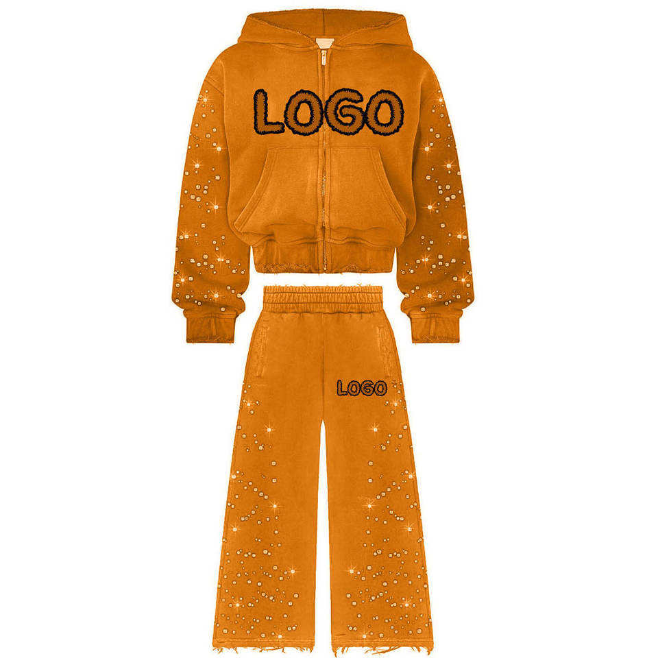 ชุดวอร์มแบบมีฮู้ดพิมพ์โลโก้ตามสั่งคุณภาพสูง ผ้าฝ้ายฟลีซ ประดับคริสตัล น้ำหนักมาก ระบายอากาศได้ดี เหมาะสำหรับวิ่งออกกำลังกาย