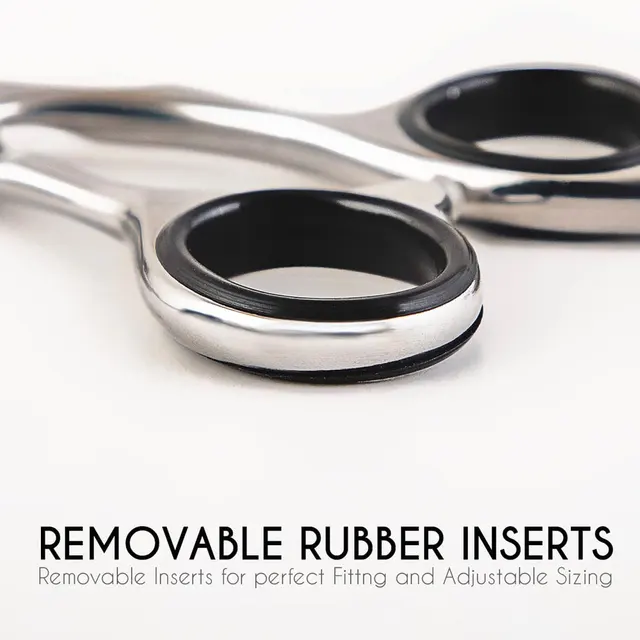 กรรไกรตัดผมสแตนเลสแบบปลายแหลมพร้อมนิ้วพักแหวนยางร้านตัดผมแบบออกแบบโลโก้ได้ตามต้องการ