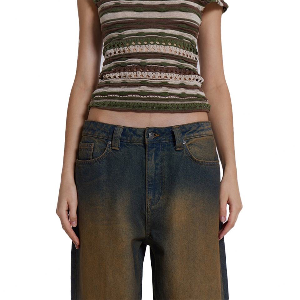 กางเกงยีนส์เดนิมทรงหลวมคุณภาพสูงสำหรับผู้หญิง ล้างแบบ Monkey Wash ทรงขากว้าง สไตล์วินเทจสุดพิเศษ