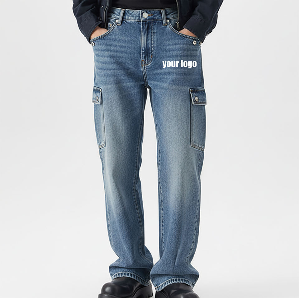 กางเกงสตรีทแวร์สีน้ำเงินคุณภาพสูงสั่งทำพิเศษ แต่งกระเป๋าข้างแบบคาร์โก้ ระบายอากาศได้ดี ตกแต่งด้วยกระดุม