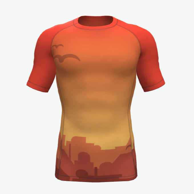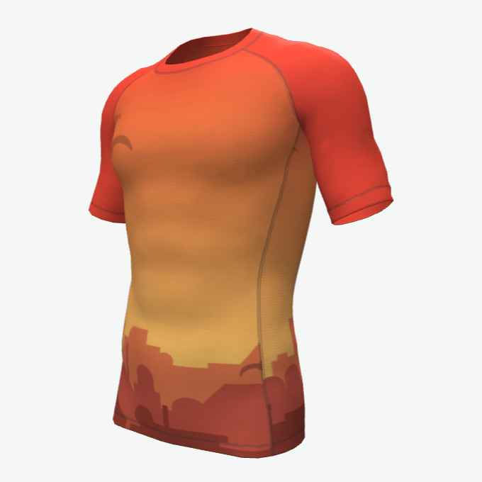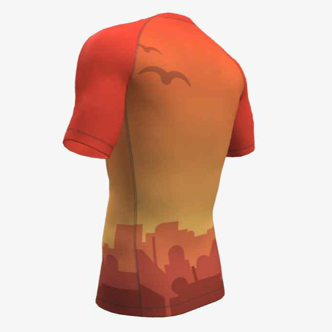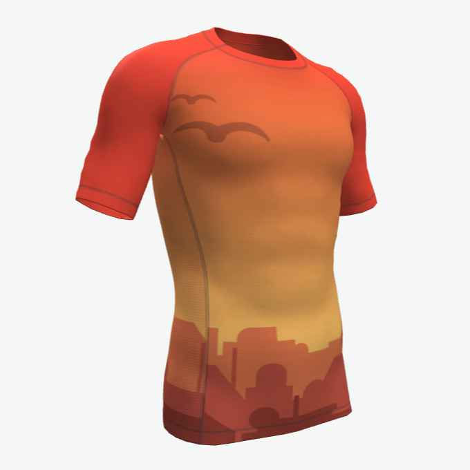 เสื้อรัดรูปป้องกันผดผื่นระบายอากาศพิมพ์ลายซับลิเมตคุณลักษณะ UPF50กันยูวีตามสั่ง