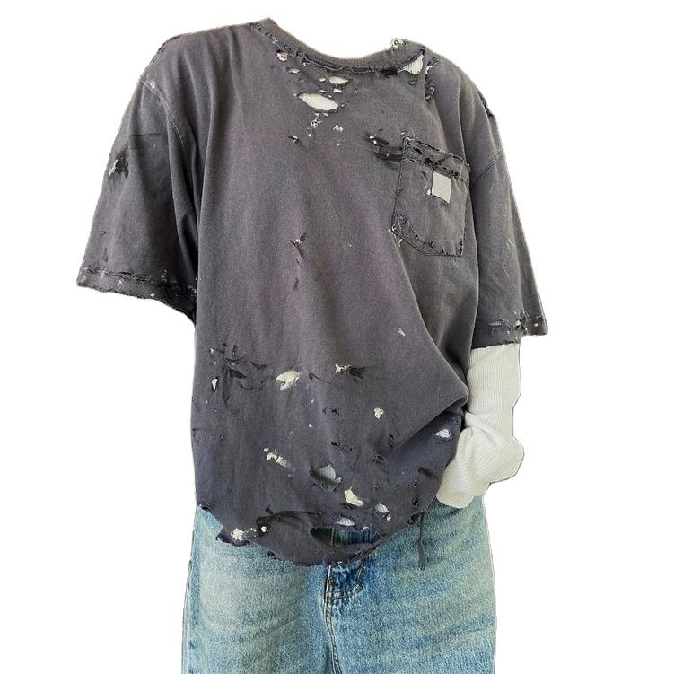 เสื้อยืดผู้ชายคุณภาพสูงแบบสั่งทำพิเศษ ทรงหลวม ไหล่ตก ผ้าสองชั้น 100% ผ้าฝ้ายเฟรนช์เทอร์รี่ ทรงปกติ ล้างสีแบบแอซิดวอช สไตล์ดิสเทรส