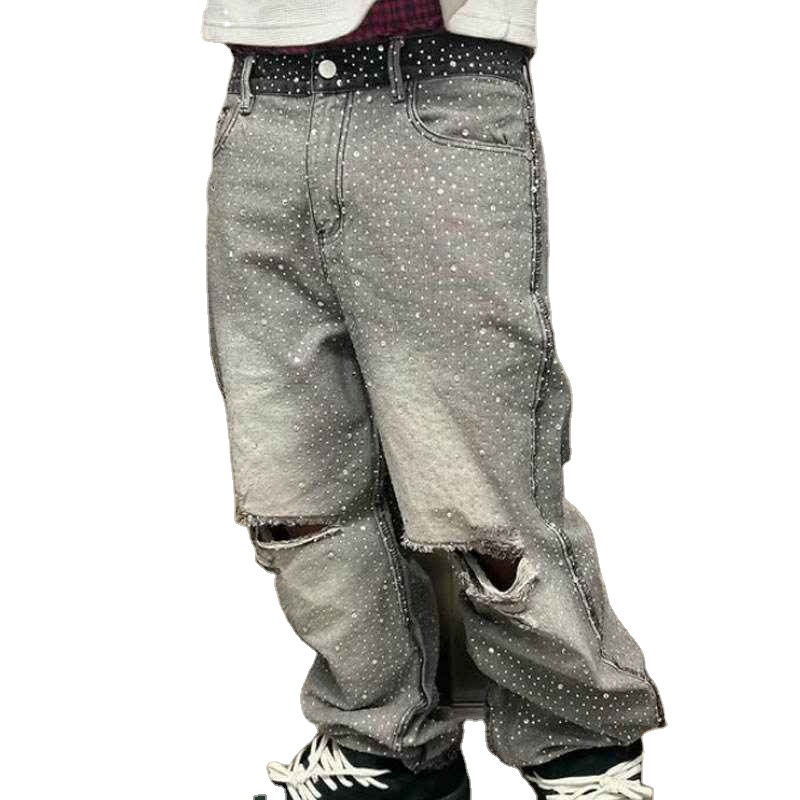 กางเกงยีนส์เดนิมผู้ชายคุณภาพสูงแบบสั่งทำพิเศษ ประดับด้วยคริสตัล พร้อมดีไซน์ขาดๆ แบบดิสเทรส ผลิตในปากีสถาน ทรงเข้ารูป ล้างสีแบบแอซิดวอช