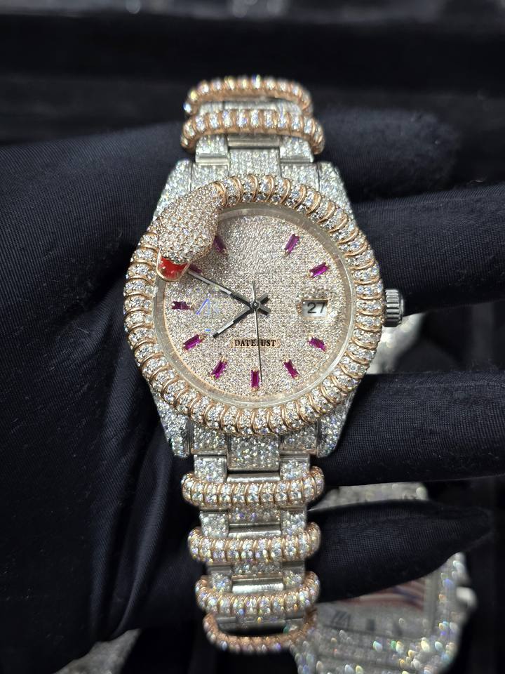 นาฬิกาข้อมือผู้ชายสแตนเลสสตีลคุณภาพสูง ระบบอัตโนมัติ พร้อมหน้าปัดลายงูแบบโรมัน ประดับเพชรโมอิสซาไนต์ VVS สองสี สไตล์หรูหรา