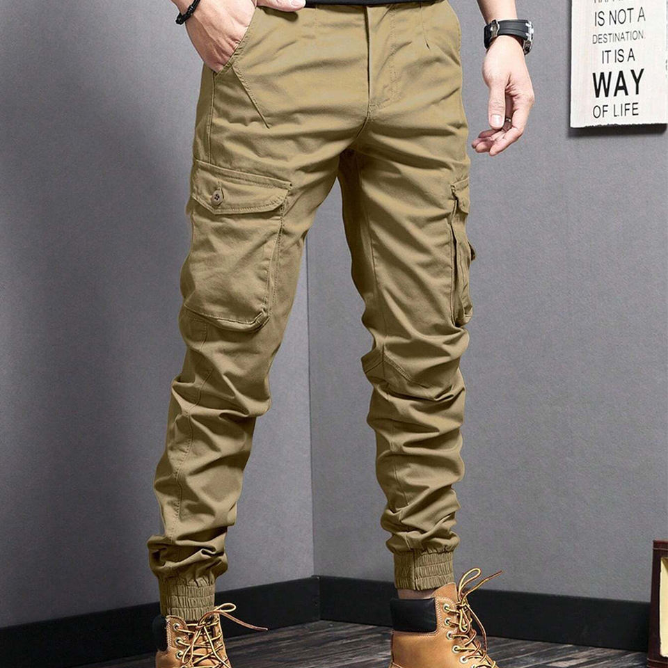 กางเกงคาร์โก้ผู้ชายแบบสั่งทำกางเกงทำงานแนวยุทธวิธีเอวยางยืดมีกระเป๋าหลายกระเป๋าทรงตรง