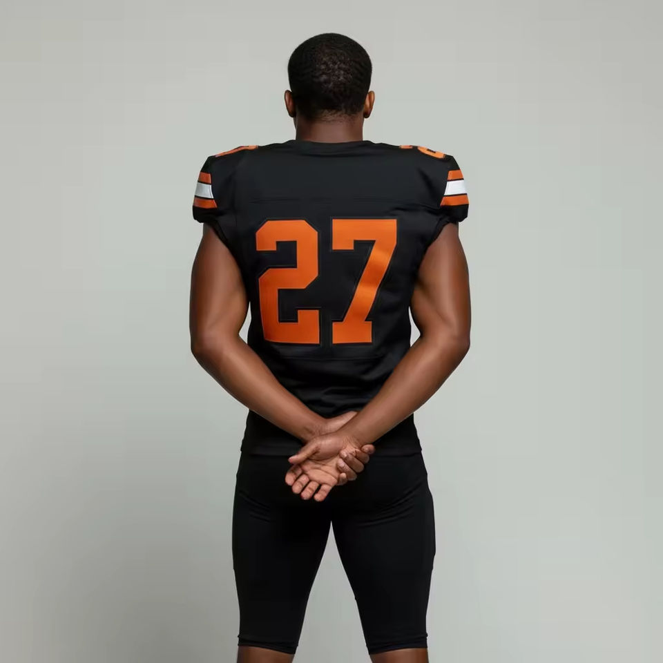 ชุดยูนิฟอร์มอเมริกันฟุตบอลคุณภาพสูงสำหรับผู้ชายไซส์ใหญ่ ระบายอากาศได้ดี ผลิตจากโพลีเอสเตอร์ 100% พร้อมบริการพิมพ์ลายแบบ Sublimation และบริการ OEM