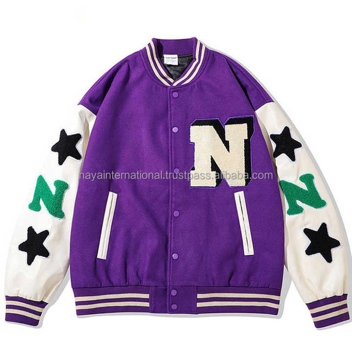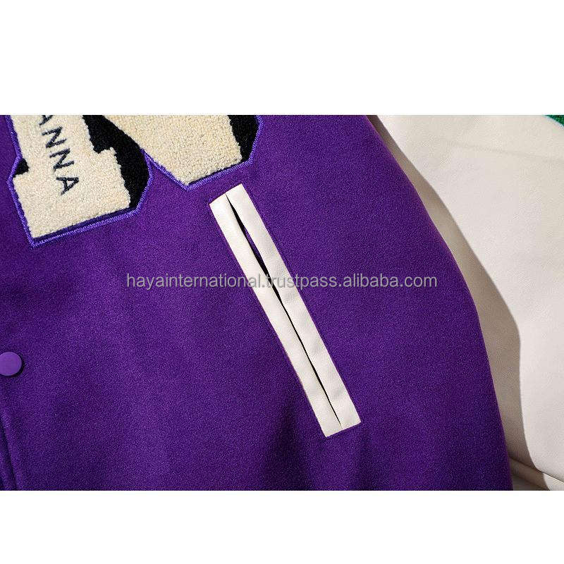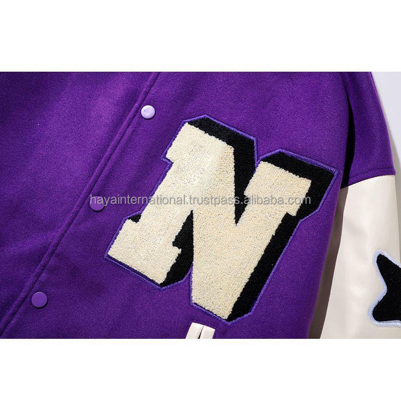 แจ็กเก็ตเบสบอลผ้าสักหลาดกำมะหยี่สำหรับผู้ชายผ้าขนสัตว์สีม่วงสำหรับกีฬากลางแจ้งปรับแต่งได้